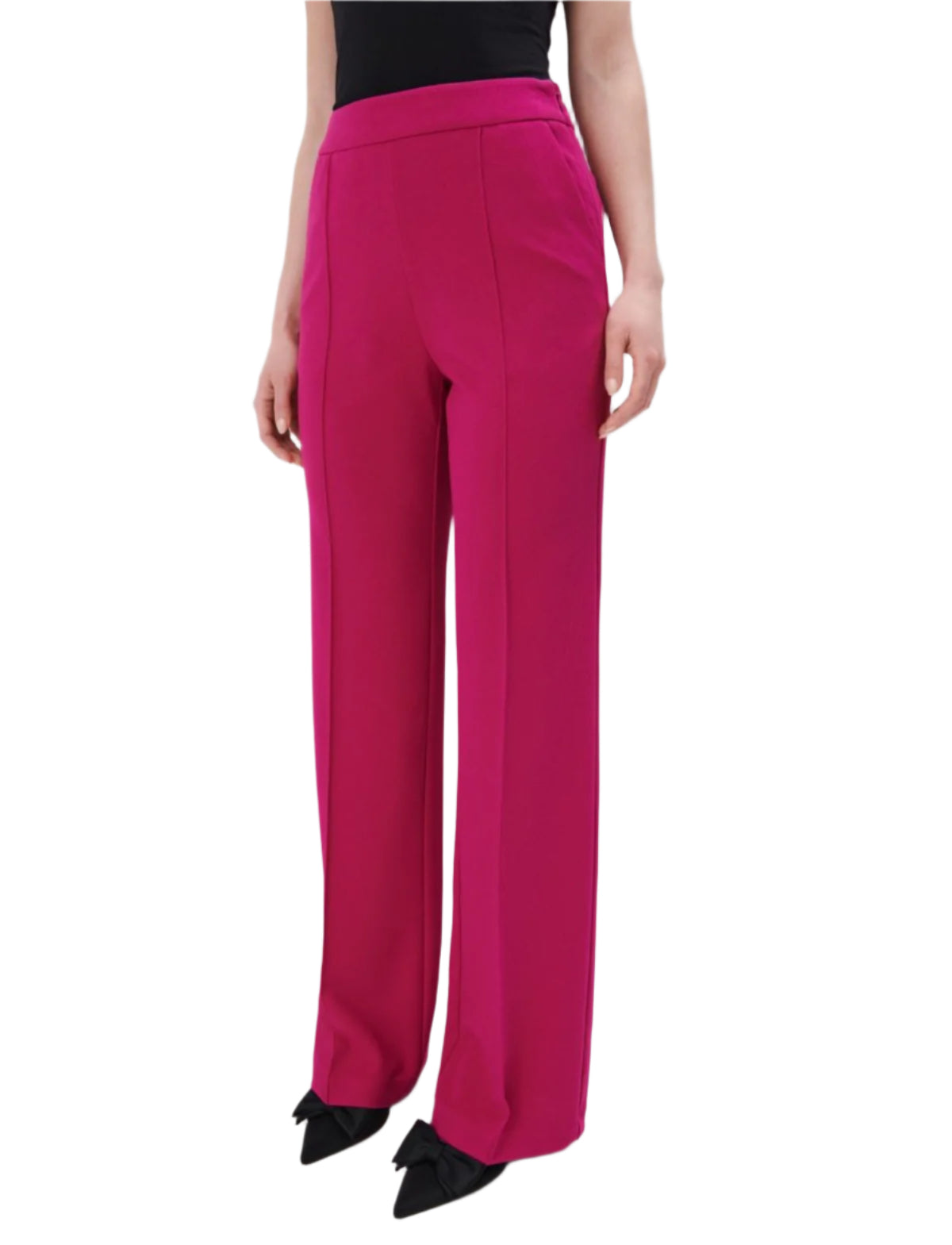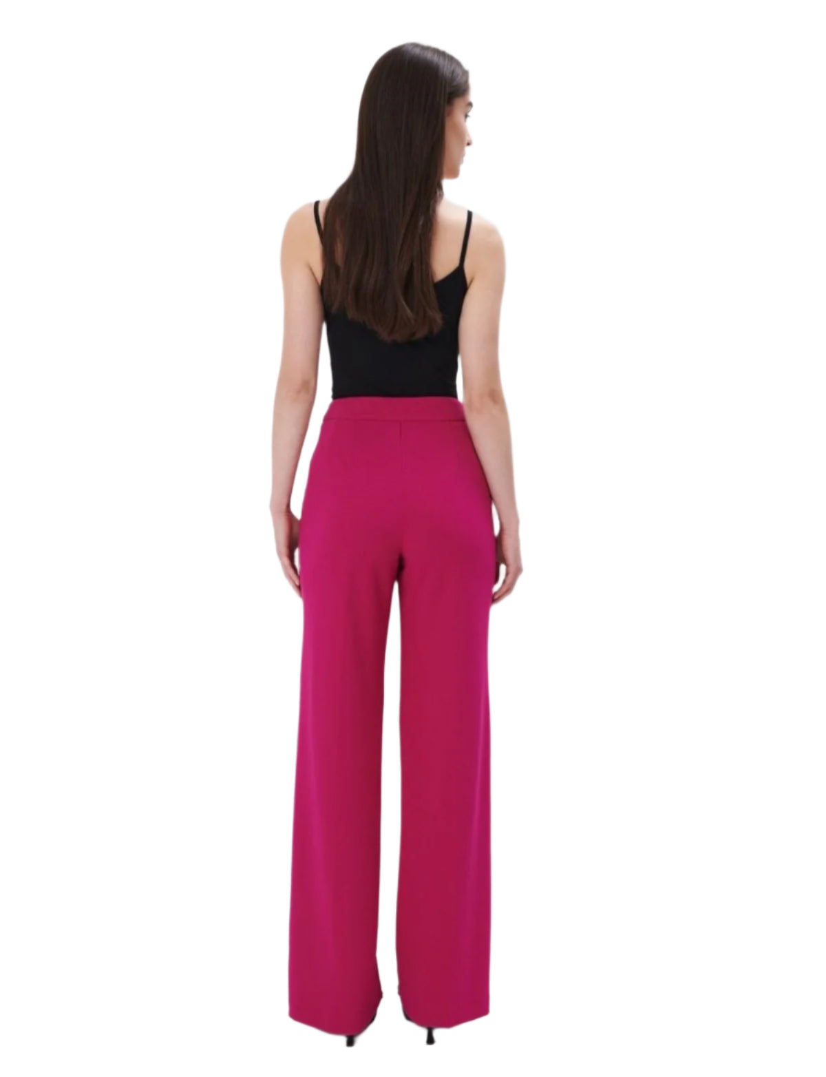 Címke nélküli, pink színű nadrág, elegáns bő szárú fazonnal és magasított derékrésszel. Kényelmes viselet, letisztult szabással, amely tökéletes választás alkalmi és elegáns megjelenéshez.