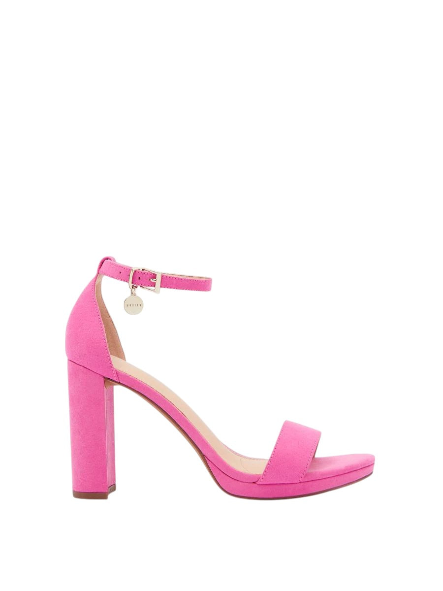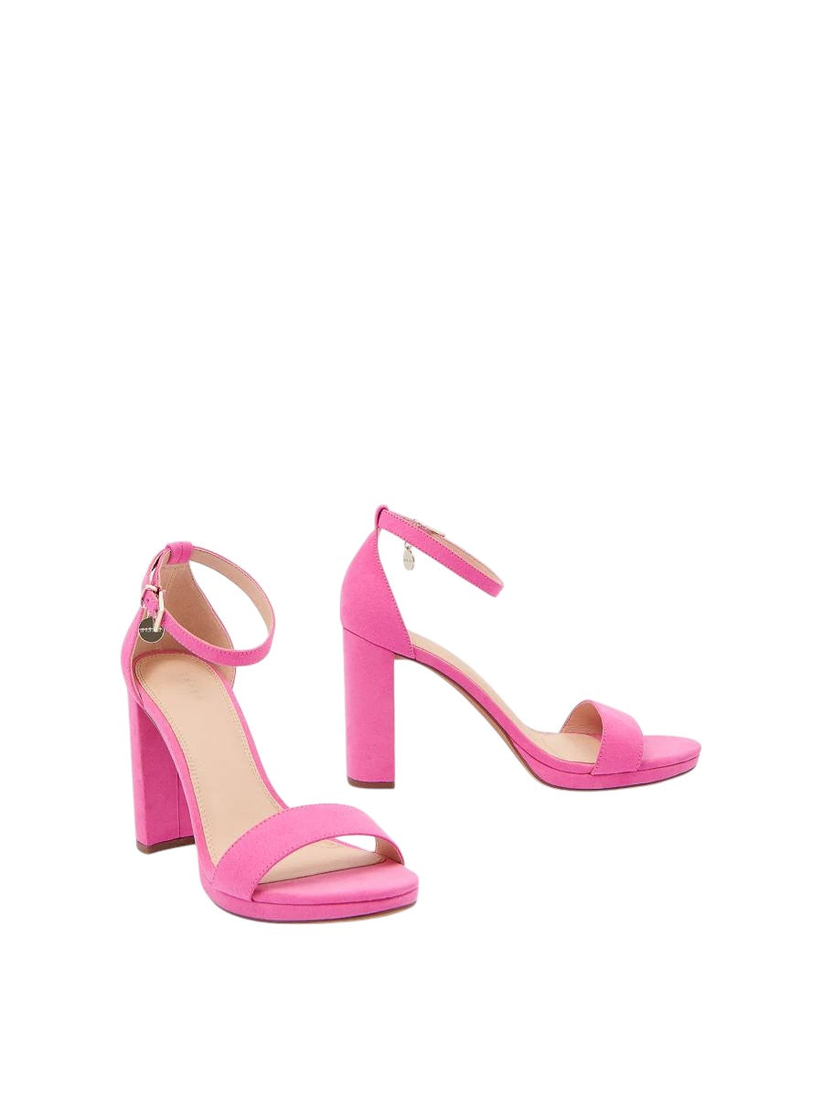 Címke nélküli, pink, velúr hatású szintetikus, szandál fazon, nyitott, kerek orr, vékony pánt a lábujjaknál, bokapánt csattal, magas tömbsarok platform talppal. Belső talp hossz: 23cm