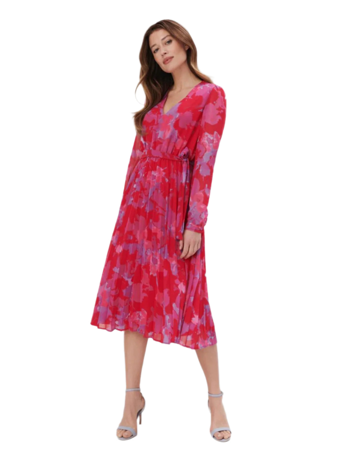 Címke nélküli, nőies és elegáns piros-rózsaszín virágmintás midi ruha. Lágy esésű, könnyed anyagból készült, amely kényelmes viseletet biztosít egész nap. Mély V-nyakkivágással, hosszú ujjakkal és derékrésznél megkötővel, amely kiemeli az alakot. A pliszírozott szoknyarész romantikus megjelenést kölcsönöz. Ideális választás alkalmi eseményekre, randira vagy elegánsabb hétköznapi viseletként.