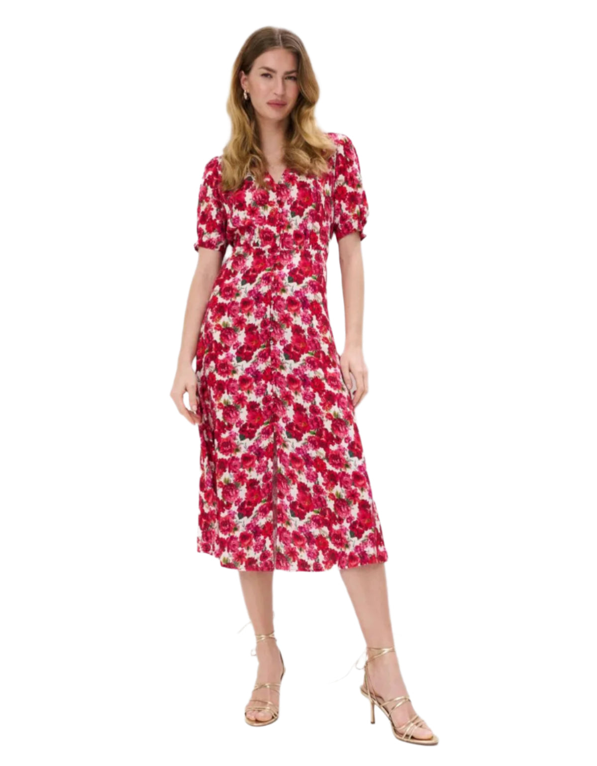 Címke nélküli, élénk piros virágmintás midi ruha V-kivágású nyakkal és rövid puffos ujjakkal. Könnyed, nőies fazonja kényelmes viseletet biztosít, míg a derékrész enyhén karcsúsított, kiemelve az alakot. Tökéletes választás nyári sétákhoz, hétköznapi eleganciához vagy különleges alkalmakra.