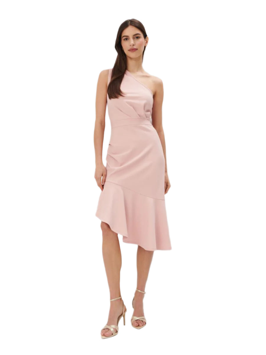 Címke nélküli, elegáns rózsaszín midi ruha aszimmetrikus, egyvállas kialakítással. Karcsúsított szabása kiemeli az alakot, míg az alján fodros részlet nőies és kifinomult megjelenést kölcsönöz. Tökéletes választás esküvőkre, koktélpartikra vagy egyéb alkalmi eseményekre