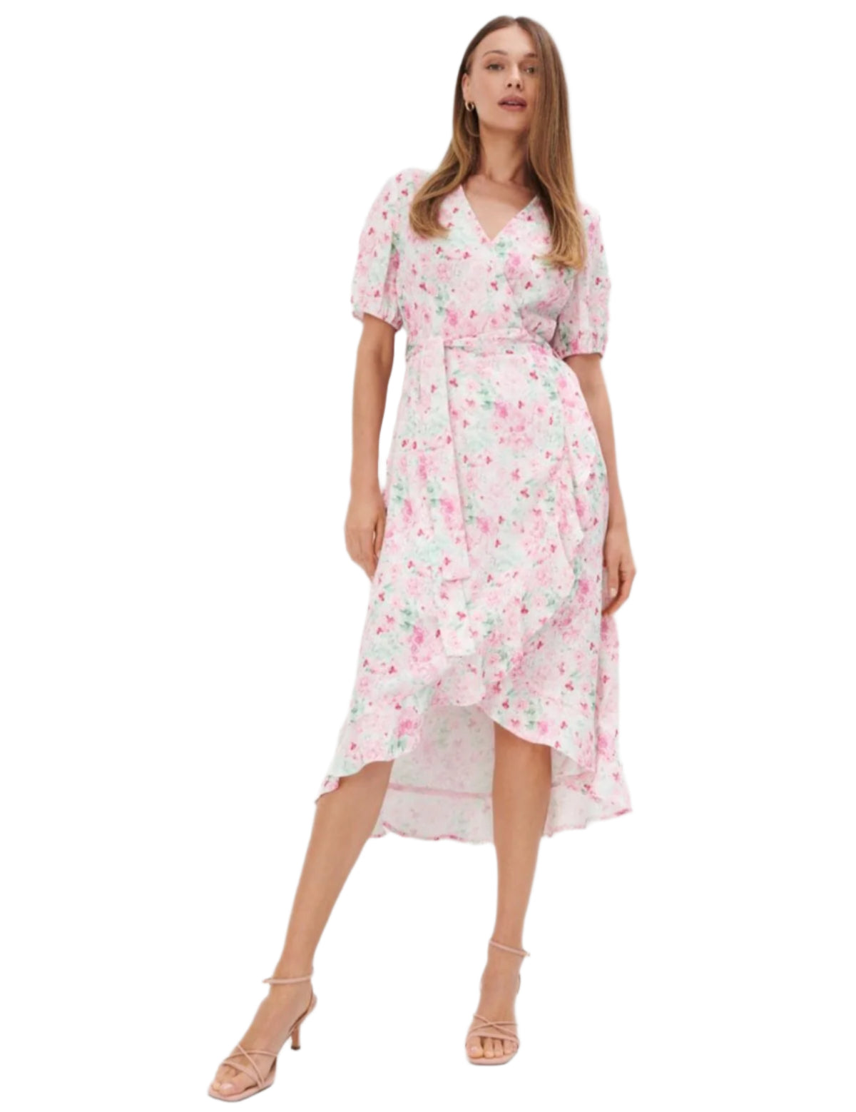 MOHITO rózsaszín virágmintás aszimmetrikus midi ruha
