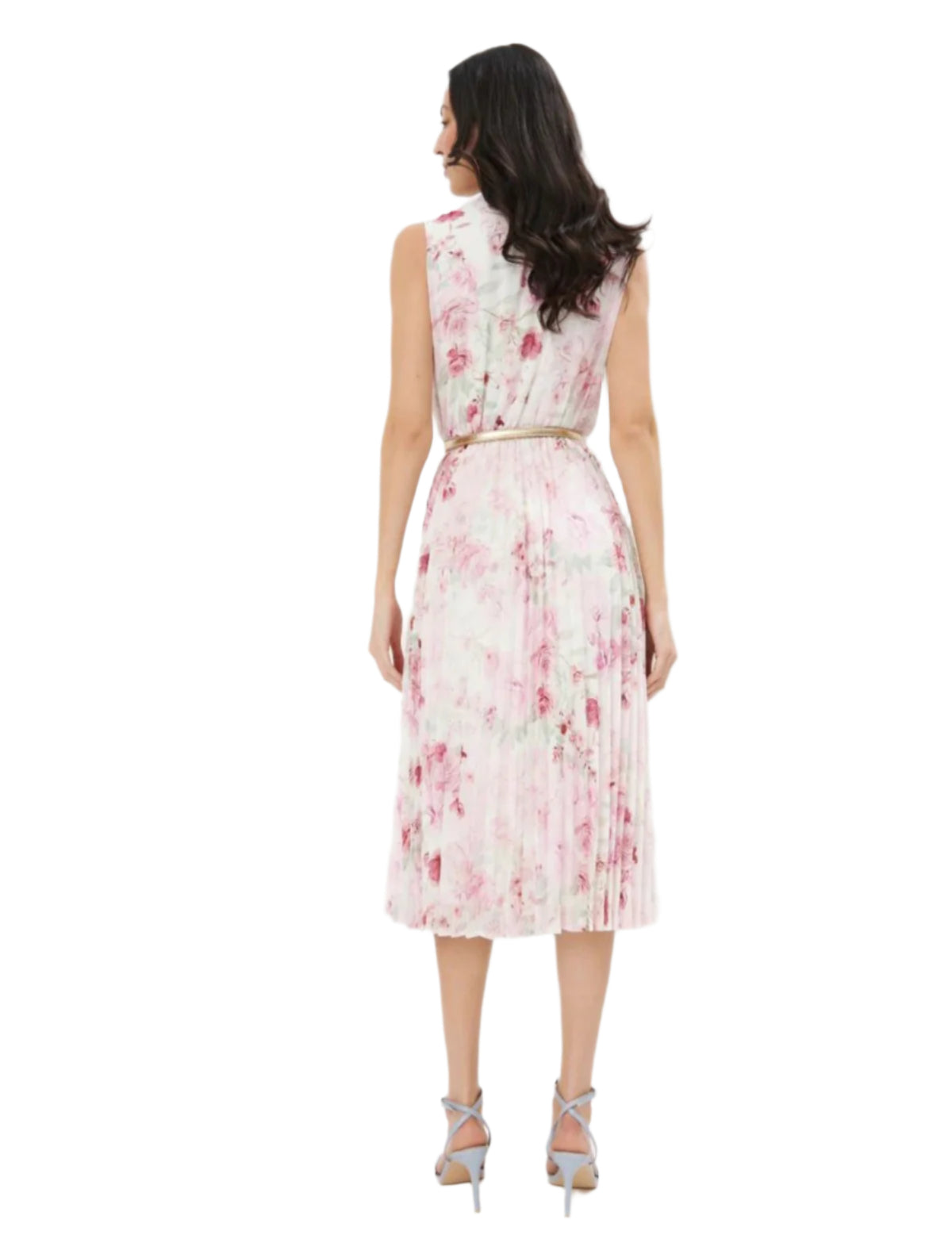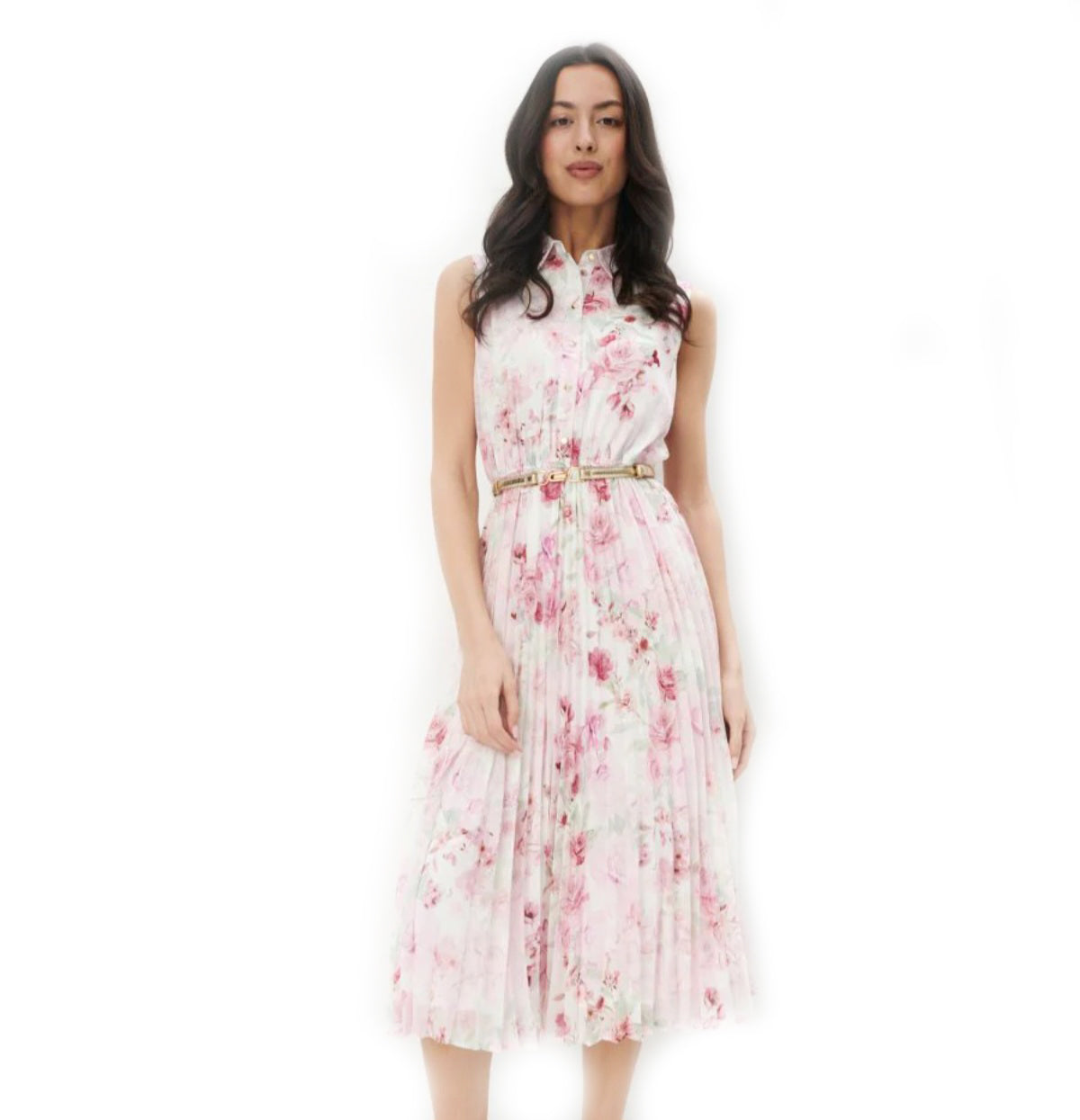 Címke nélküli, női midi ingruha, fehér alapon rózsaszín virágmintával, ujjatlan, galléros, gombos záródású, pliszírozott szoknyarésszel, derékhangsúlyos szabással és övvel, elegáns és romantikus viselet alkalmakra vagy tavaszi-nyári megjelenéshez.