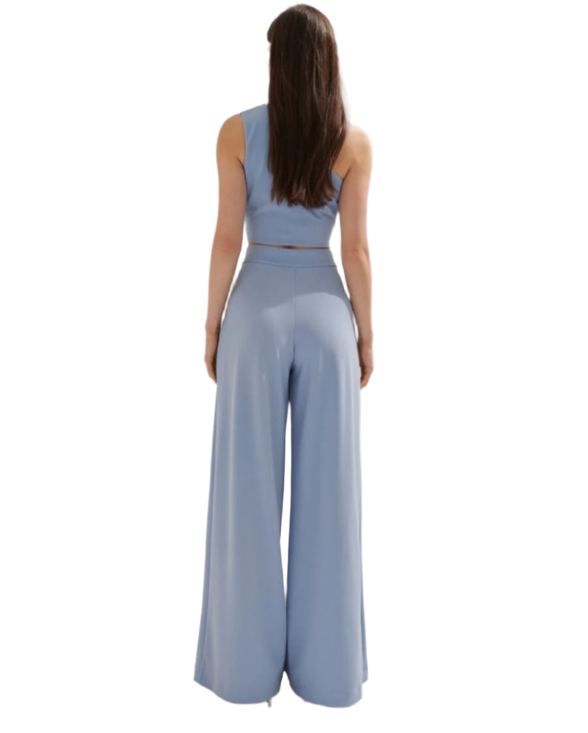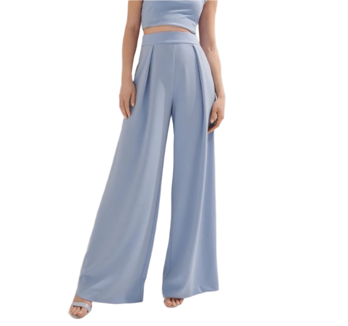 Címke nélküli, női elegáns nadrág, világoskék színű, magas derekú, bő szárú fazon, elöl hajtásokkal, letisztult és kifinomult megjelenés, tökéletes választás alkalmi vagy elegáns viselethez.