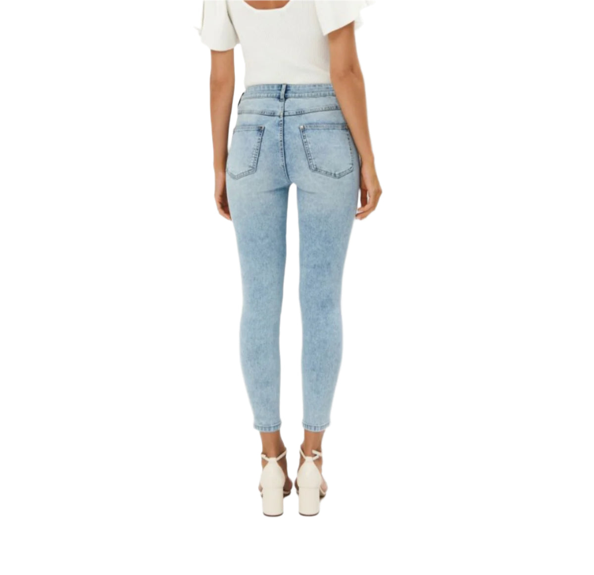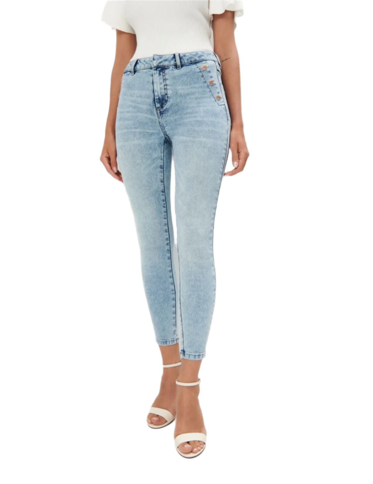 Címke nélküli, világoskék skinny farmer, magas derekú, gombos díszítéssel az oldalán. Sztreccses anyag, amely kényelmes viseletet biztosít. Hétköznapi és alkalmi viseletre is tökéletes választás.