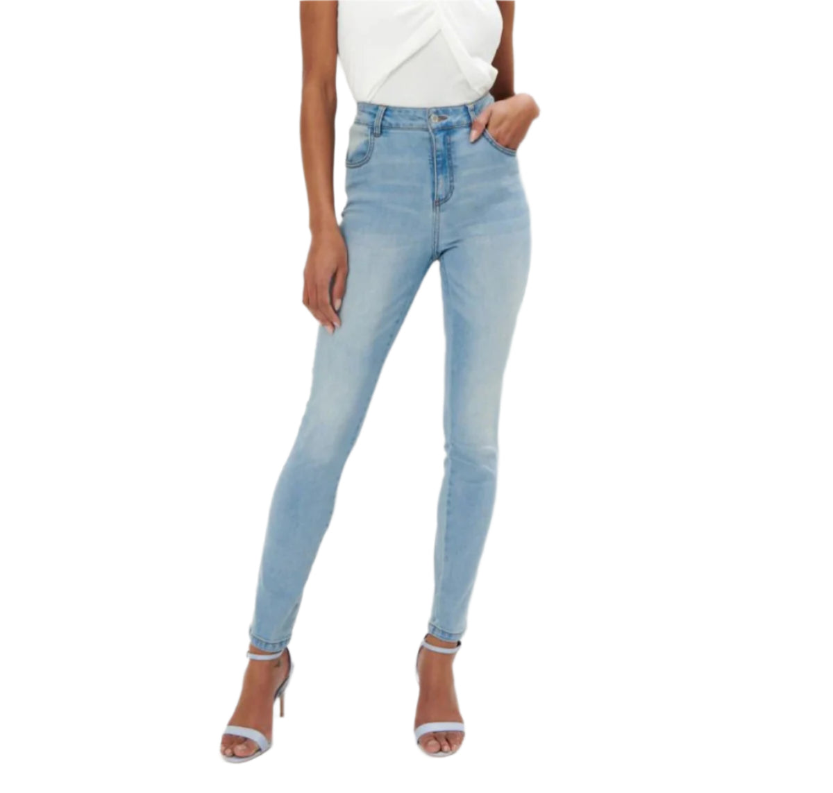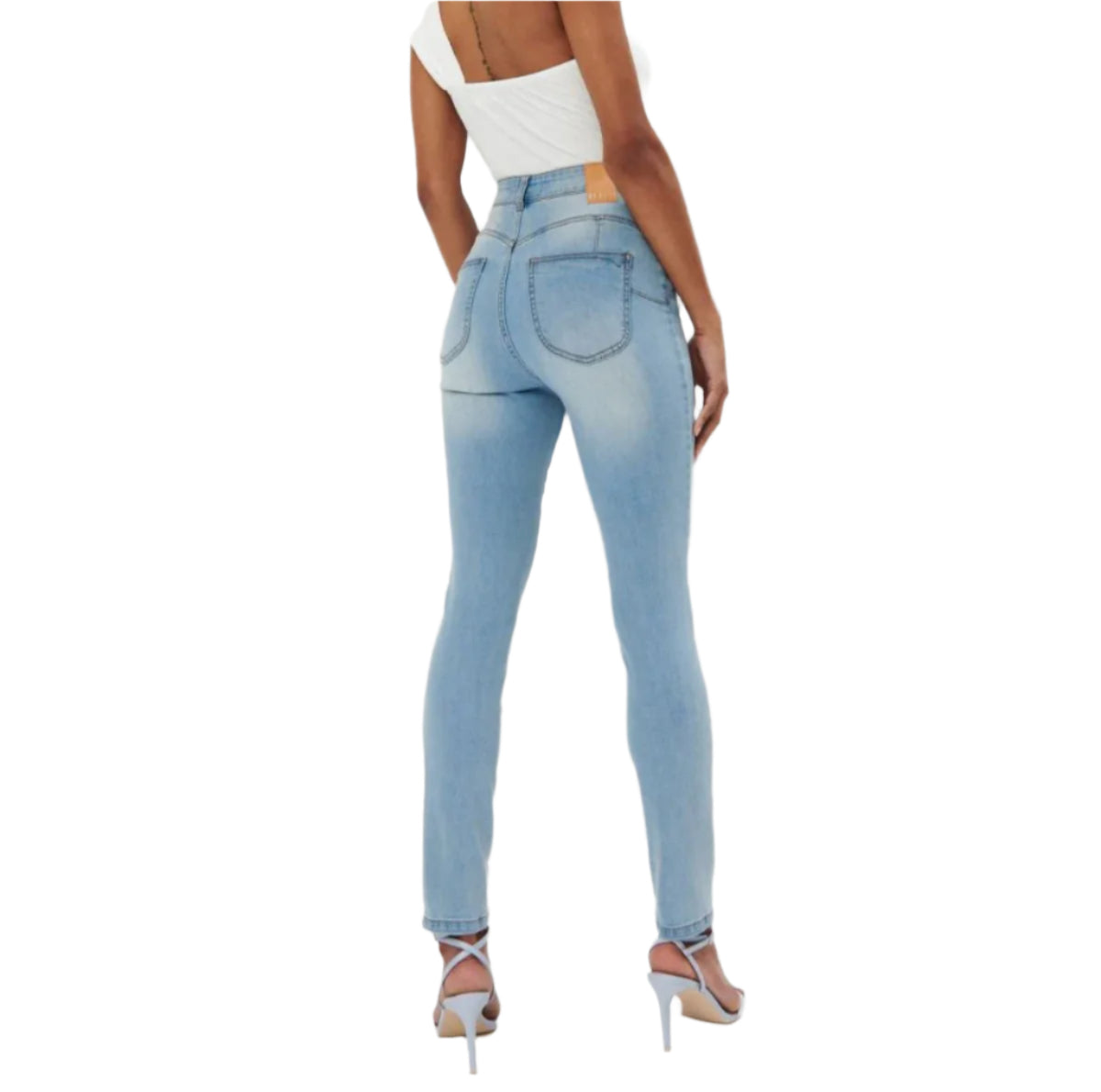 Címke nélküli, világoskék skinny farmer, magas derékkal és szűkített szárral. Kényelmes és rugalmas anyagból készült, amely kiemeli az alakot. Ideális hétköznapi viselethez és elegánsabb összeállításokhoz is.