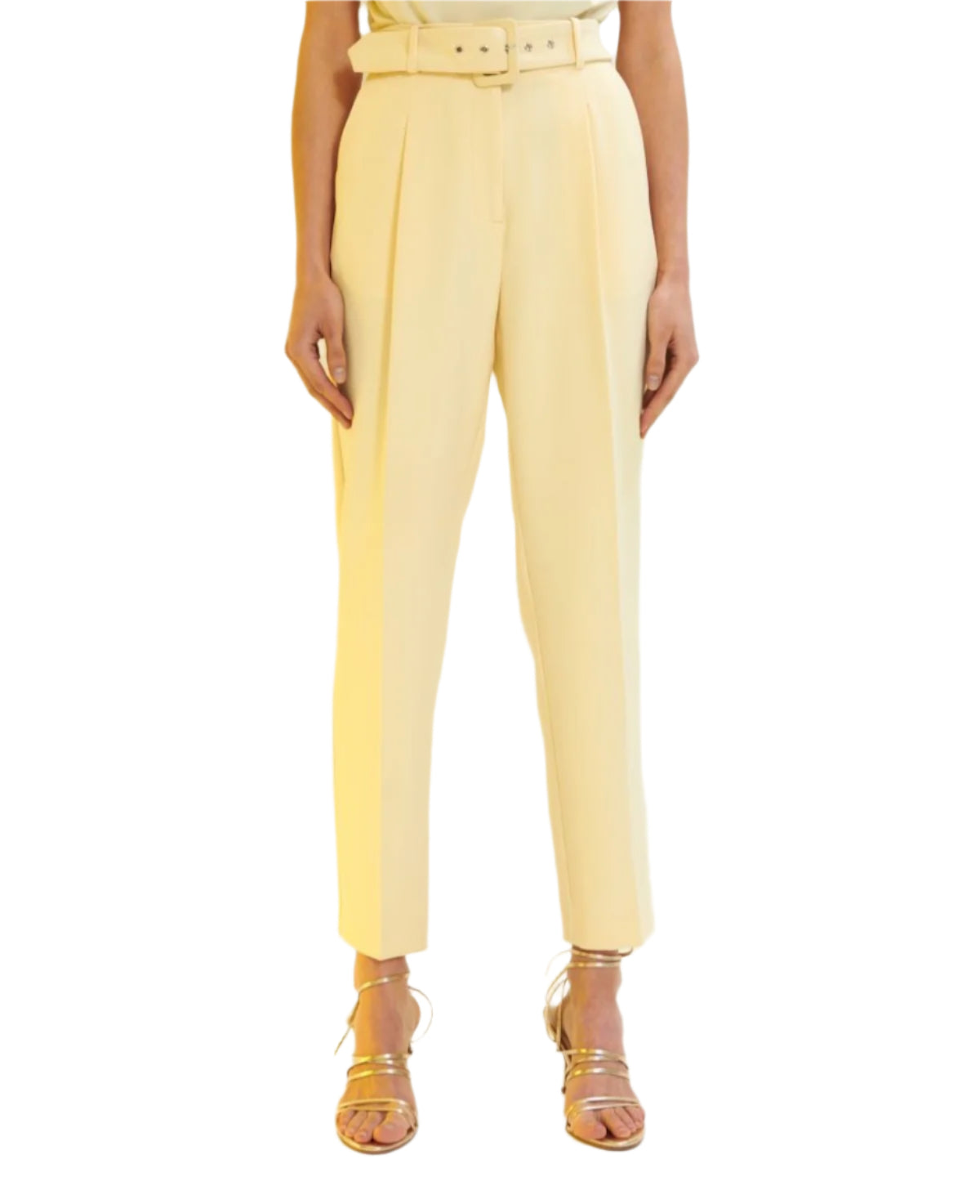 Címke nélküli, női elegáns nadrág, világossárga színű, magas derekú, szűkített szárú fazon, elöl hajtásokkal, hozzáillő díszes övvel, kifinomult és trendi viselet irodai vagy alkalmi megjelenéshez.