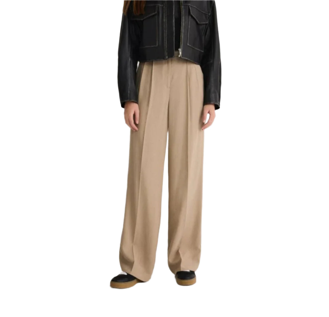 Címke nélküli, női elegáns nadrág, bézs színű, magas derekú, bő szárú fazon, elöl hajtásokkal, letisztult és kifinomult megjelenés, tökéletes választás irodai vagy alkalmi viselethez.