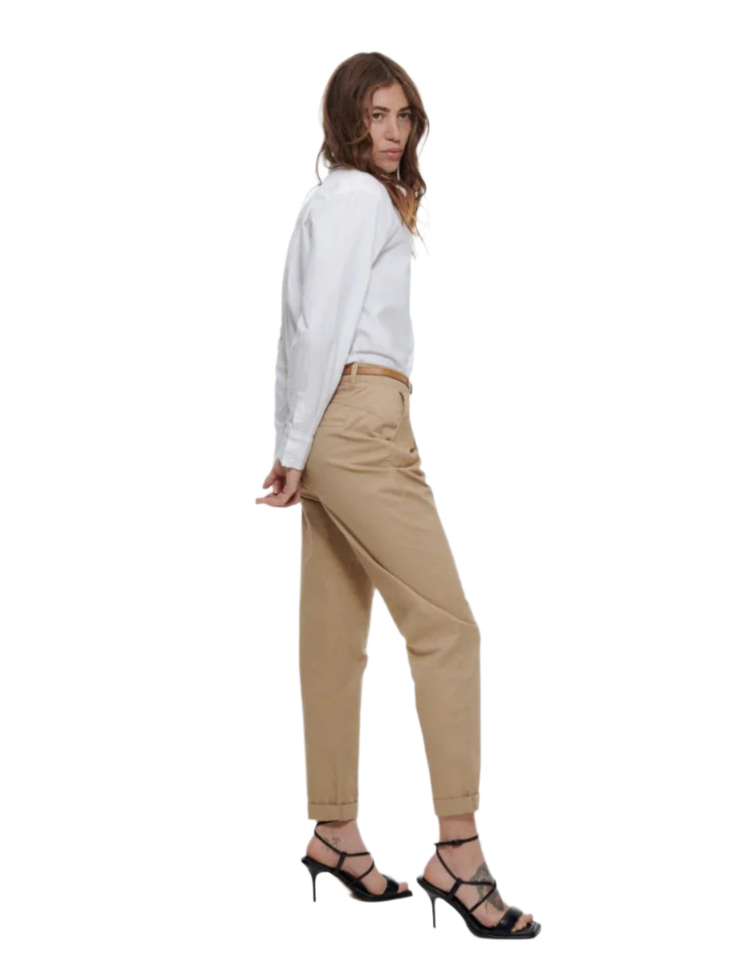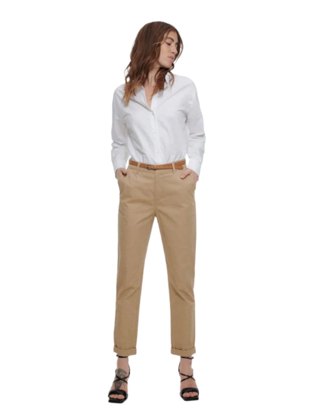 Címke nélküli, női chino nadrág, bézs színű, magas derekú, slim fit fazon, hajtott szárvégekkel, övbújtatós kialakítással, elegáns és kényelmes viselet irodai vagy hétköznapi megjelenéshez.