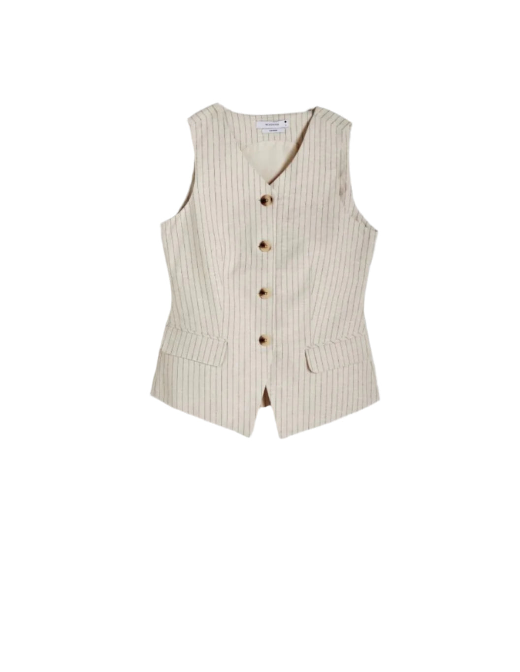 Címke nélküli, női elegáns mellény, bézs alapon vékony csíkos mintával, V-kivágású, gombos záródású, karcsúsított fazonú, elöl zsebfedős részletekkel, klasszikus és kifinomult megjelenés, tökéletes választás irodai vagy alkalmi viselethez.