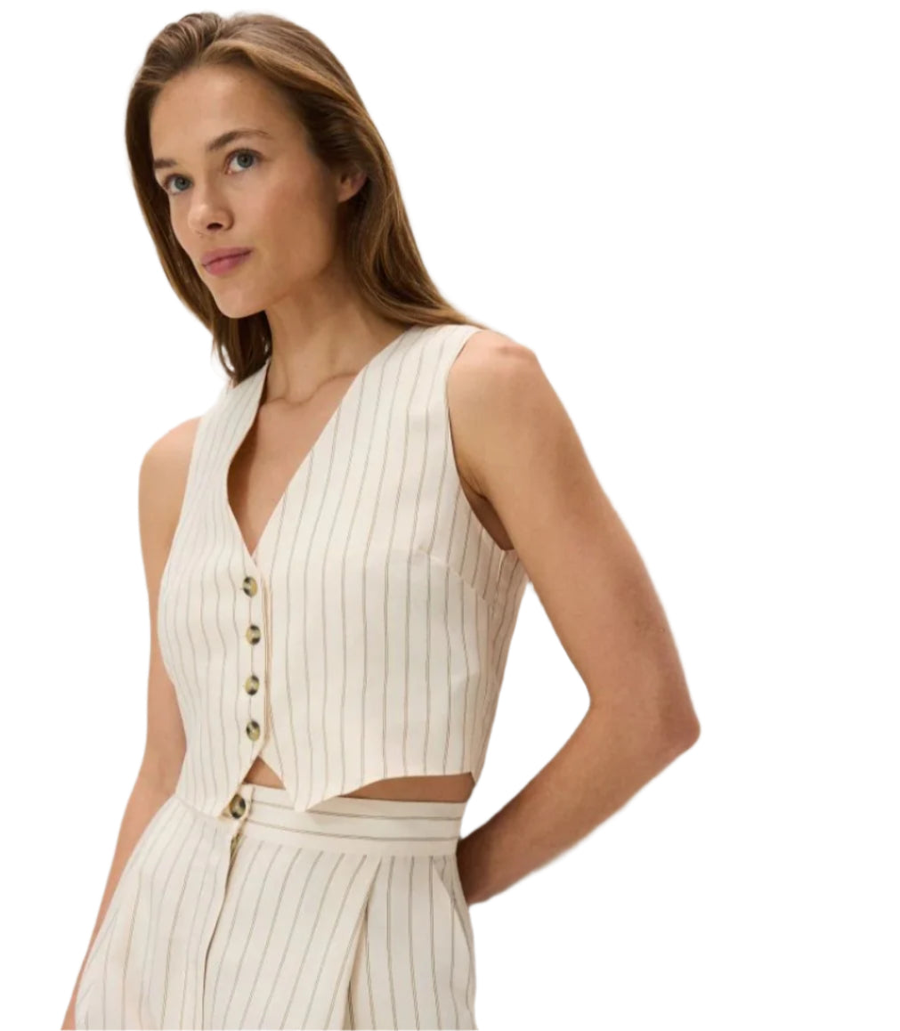 Címke nélküli, stílusos bézs mellény vékony csíkozással. Elegáns V-kivágása és karcsúsított szabása modern és kifinomult megjelenést biztosít. Gombos záródása klasszikus hatást kelt, míg rövidített fazonja különleges karaktert ad a szettnek. Tökéletes választás elegáns és hétköznapi viselethez egyaránt.