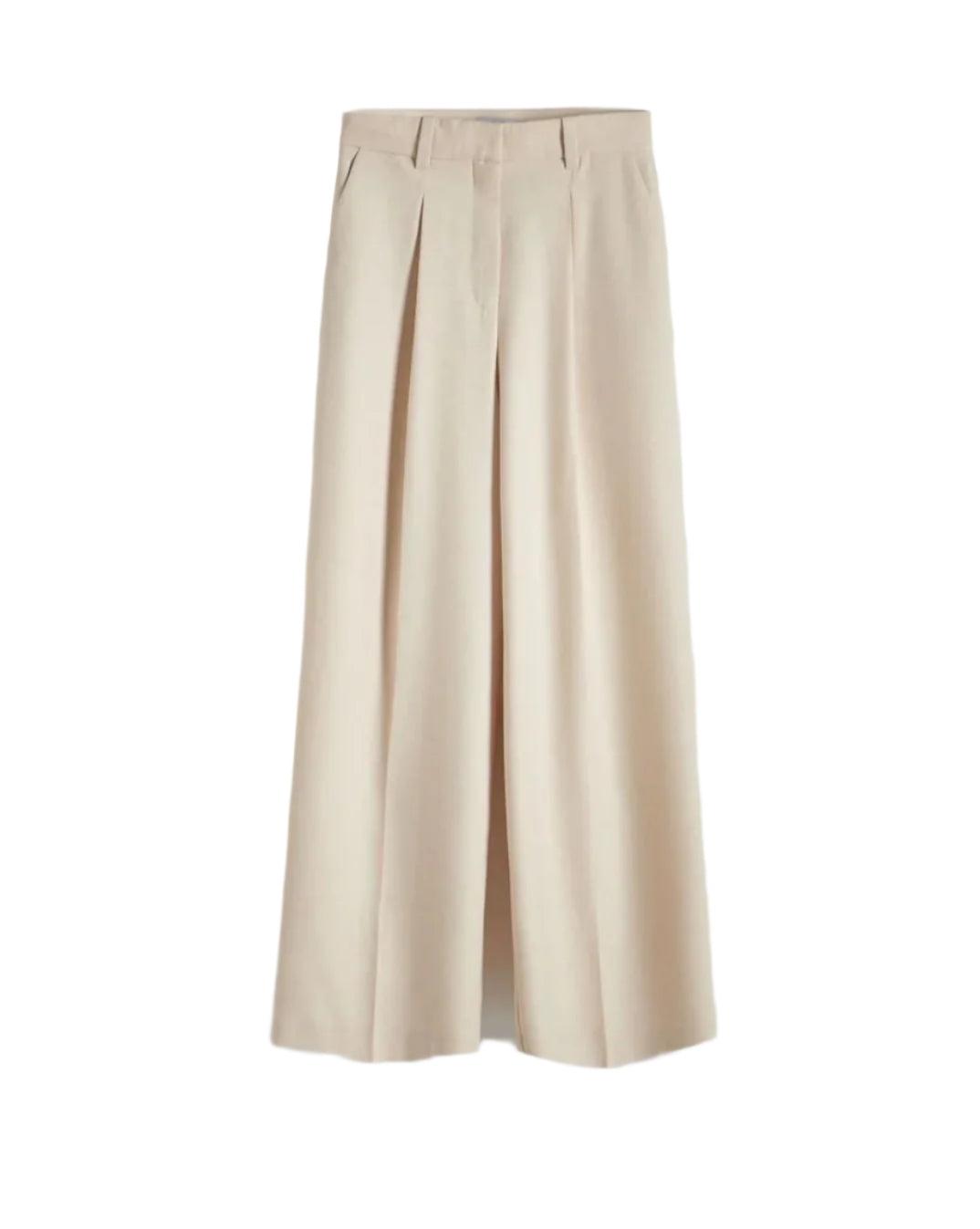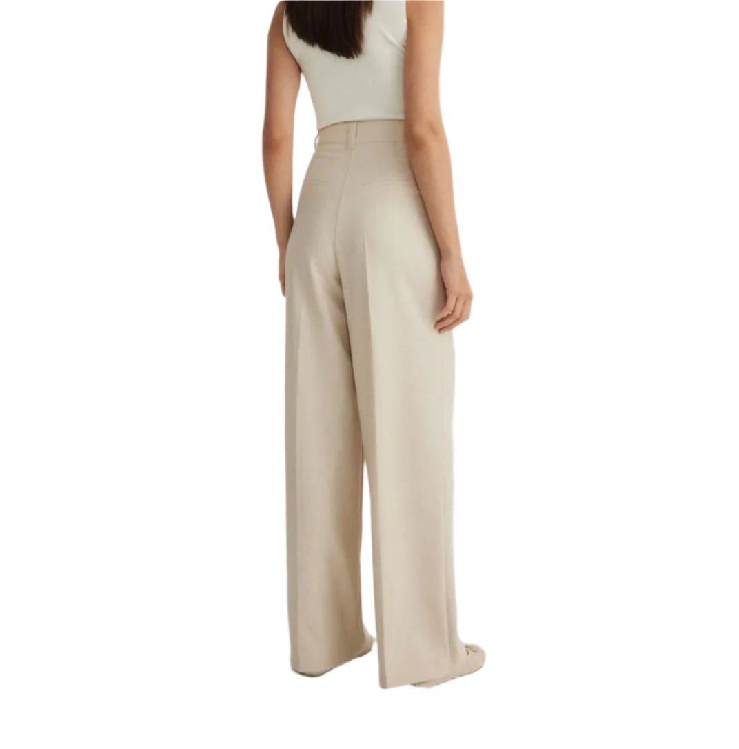 Címke nélküli, bézs színű nadrág, elegáns és bő szárú szabással. Magas derekú kialakítás, finom redőzött részletekkel és övbújtatókkal. Kényelmes és stílusos választás formális alkalmakra vagy irodai viselethez.