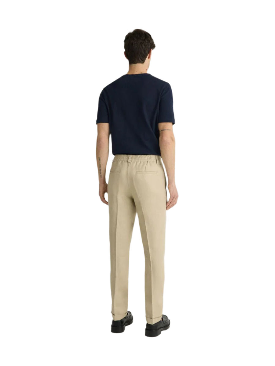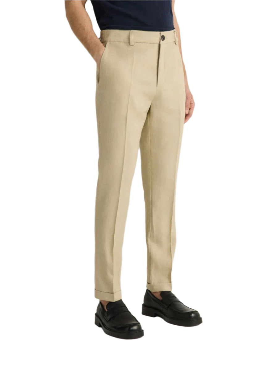 Címke nélküli, bézs színű, elegáns szövetnadrág. Egyenes szabású, magas minőségű anyagból készült, amely kényelmet és stílust biztosít. Oldalzsebekkel és övbújtatókkal ellátva, így könnyen kombinálható inggel vagy zakóval formális megjelenéshez.