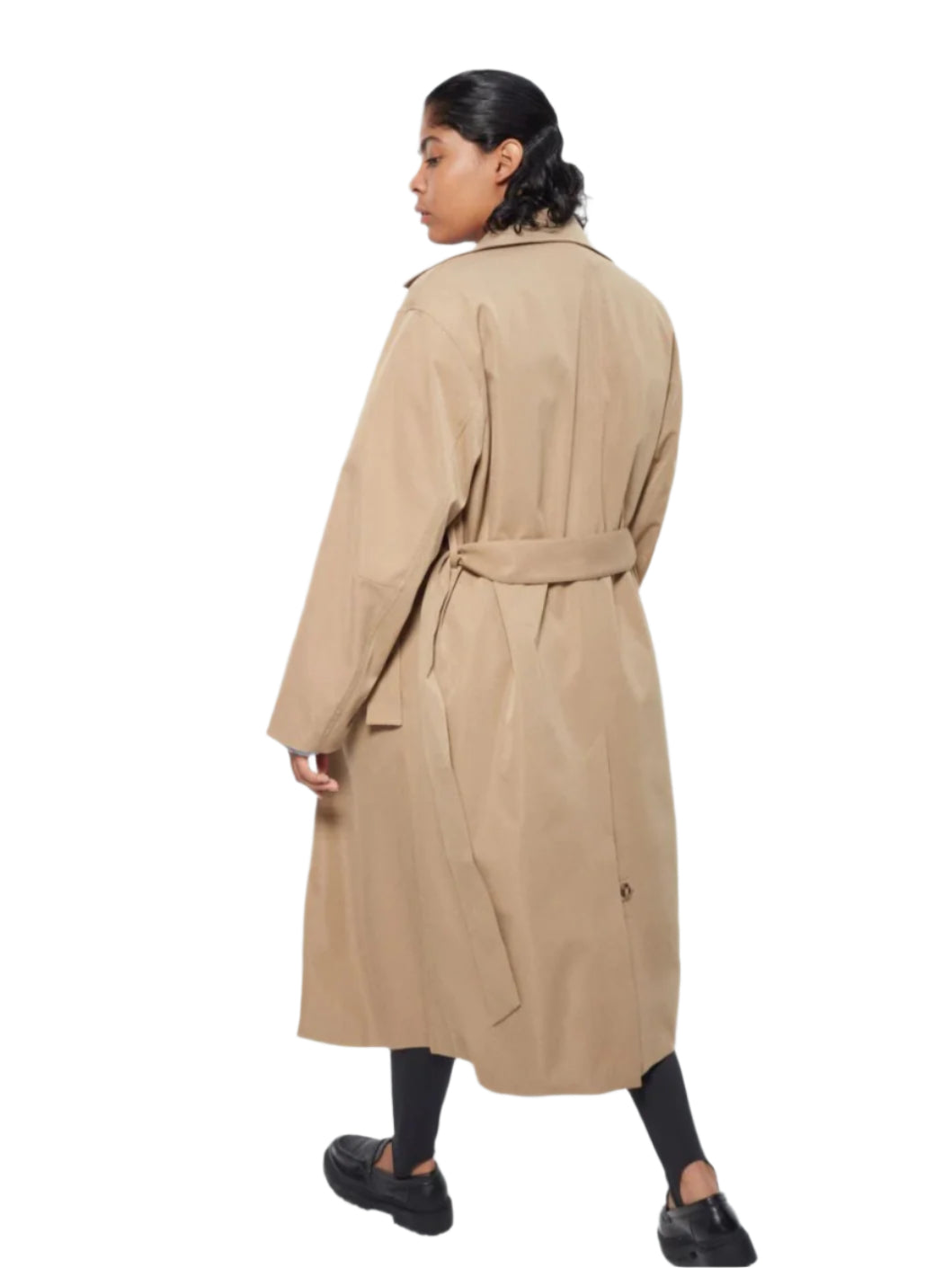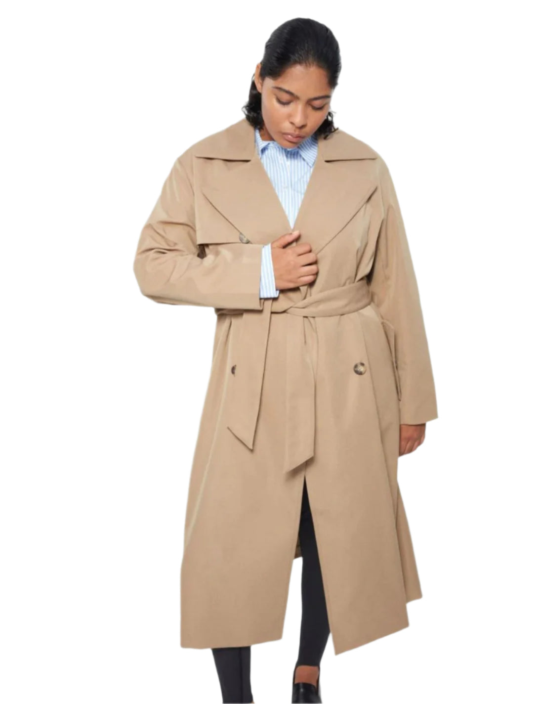 Címke nélküli, elegáns bézs ballonkabát. Duplasoros gombolás és megkötős öv a deréknál a tökéletes illeszkedés érdekében. Klasszikus gallérral és széles hajtókával rendelkezik, amely időtálló és kifinomult megjelenést kölcsönöz. Hosszított fazonja védelmet nyújt a hűvösebb időben is. Ideális választás üzleti öltözékhez, hétköznapi viselethez vagy elegánsabb alkalmakra.
