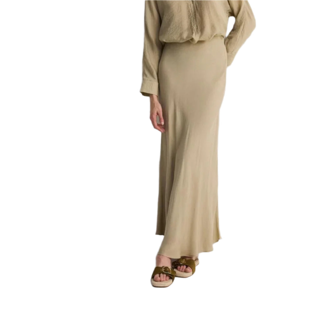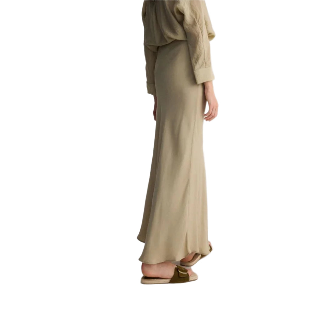 Címke nélküli, bézs színű, hosszú, testhezálló szoknya. Lágy esésű anyagból készült, amely elegáns és kényelmes viseletet biztosít. Letisztult, minimalista stílusának köszönhetően könnyen kombinálható különböző felsőkkel és cipőkkel, legyen szó hétköznapi vagy alkalmi megjelenésről.