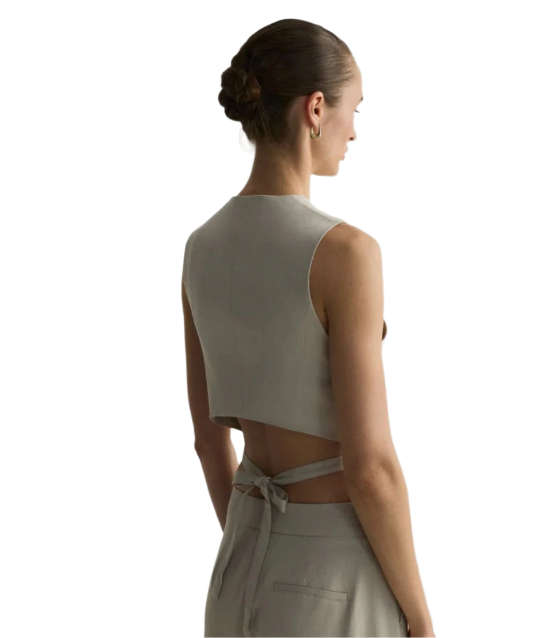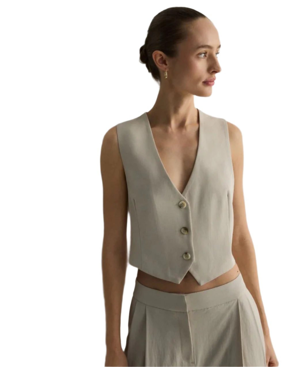 Címke nélküli, könnyed bézs lenvászon mellény V-kivágással és karcsúsított szabással. Természetes anyaga légáteresztő és kényelmes viseletet biztosít. Gombos záródása elegáns megjelenést kölcsönöz, míg rövidített fazonja modern és nőies hatást kelt. Tökéletes választás nyári és réteges öltözködéshez.