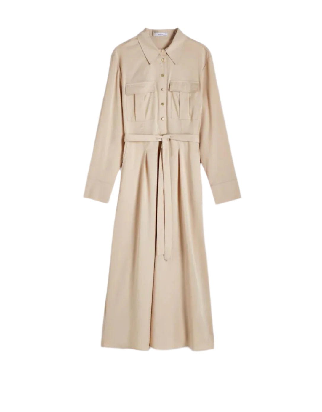 Címke nélküli, bézs színű hosszú ujjú ingruha elegáns gallérral és gombos előlappal. Két mellzsebbel és levehető övvel rendelkezik, amely kiemeli a derékvonalat. Kényelmes, mégis stílusos darab, amely tökéletes választás irodai viselethez, alkalmi eseményekre vagy hétköznapi eleganciához.