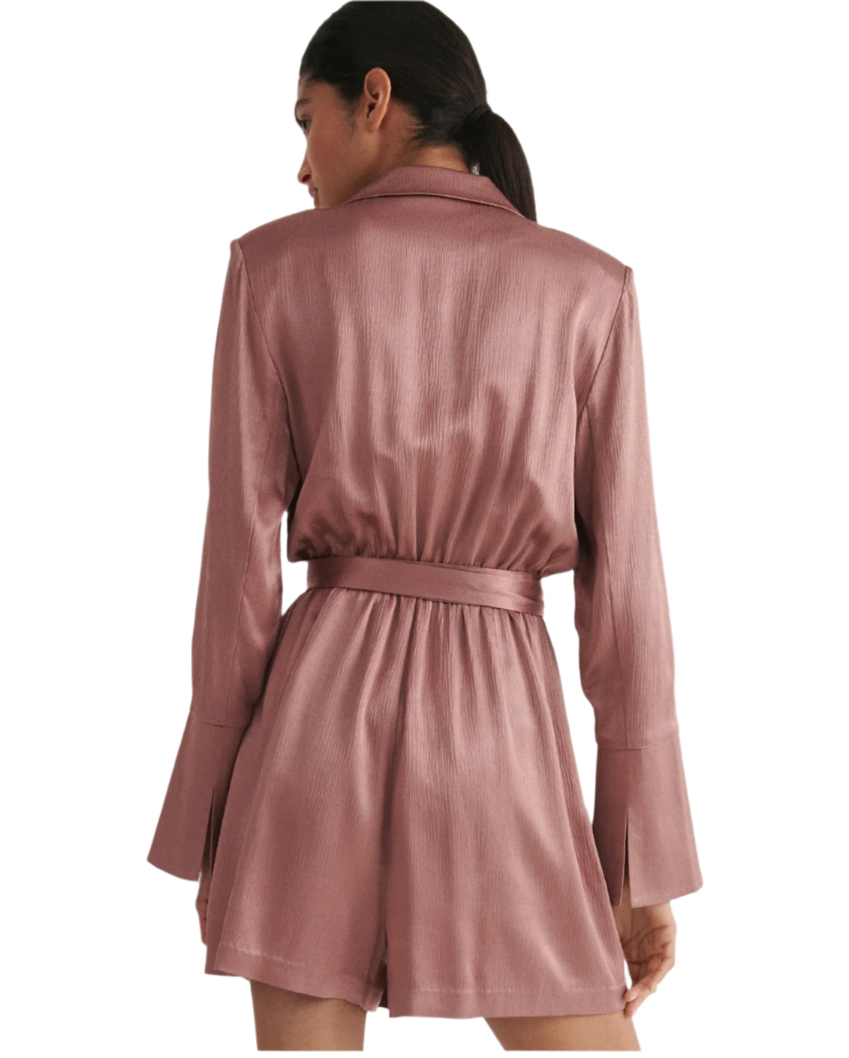 Címke nélküli, női overál, bronz színű, fényes anyagú, hosszú ujjú, V-kivágású, megkötős derékrésszel, rövid fazon, elegáns és stílusos viselet esti alkalmakra vagy különleges eseményekre.