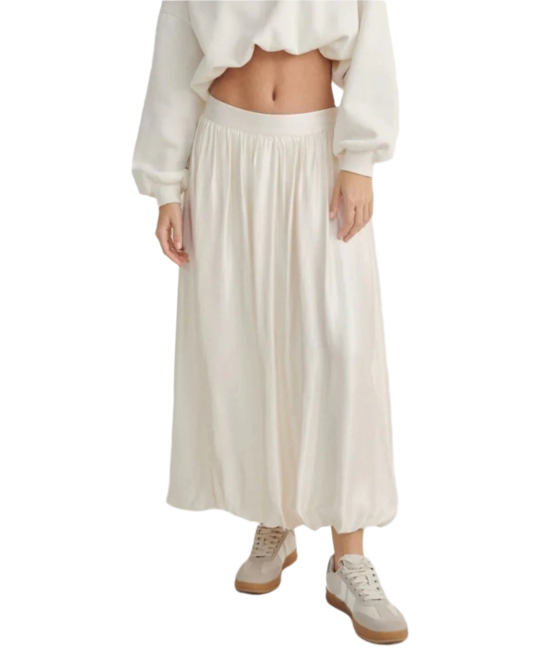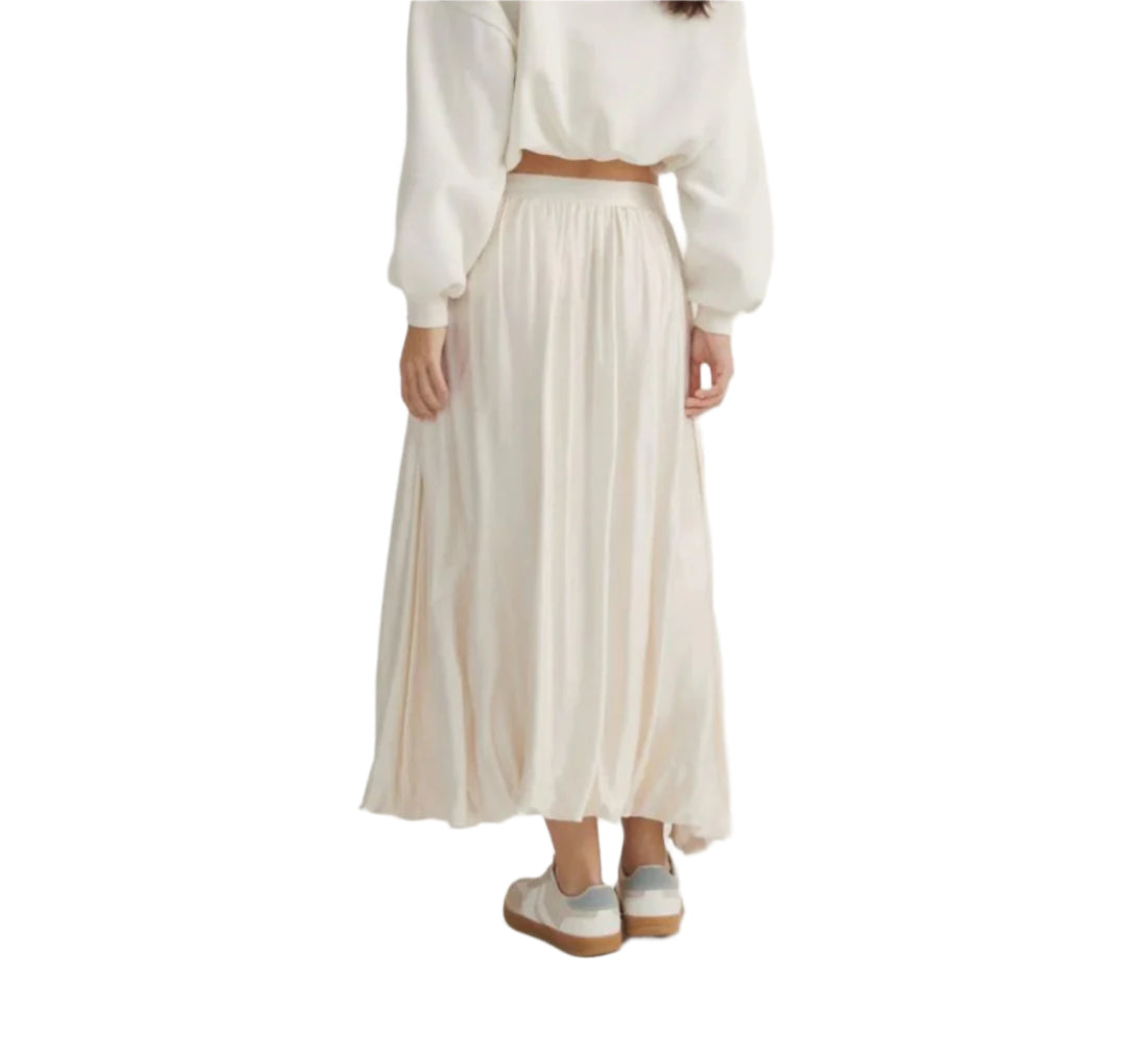 Címke nélküli, ekrü színű, hosszú, bő szabású szoknya. Könnyed, légies anyaga kényelmes viseletet biztosít, rugalmas derékrésszel rendelkezik. Az alsó részén lágyan összehúzott szabás egyedi megjelenést kölcsönöz. Tökéletes választás hétköznapi és elegánsabb összeállításokhoz is.