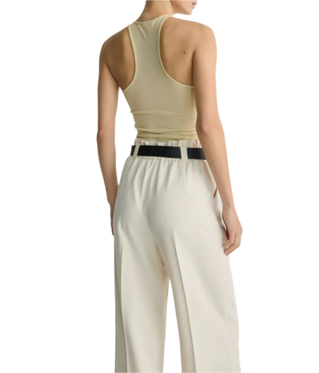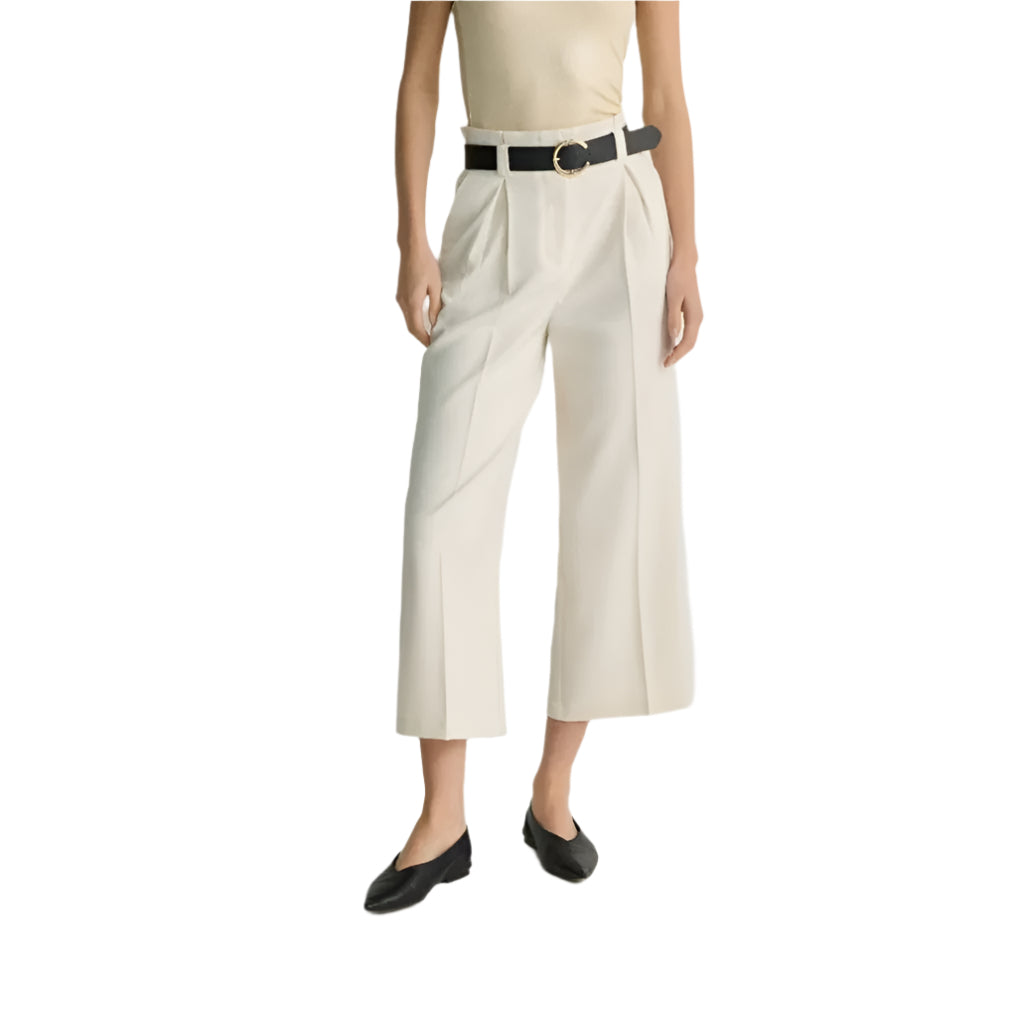 Címke nélküli, női culotte nadrág, ekrü színű, magas derekú, bő szárú fazon, térd alá érő hosszúság, elöl hajtásokkal, letisztult és elegáns megjelenés, tökéletes választás irodai vagy alkalmi viselethez.