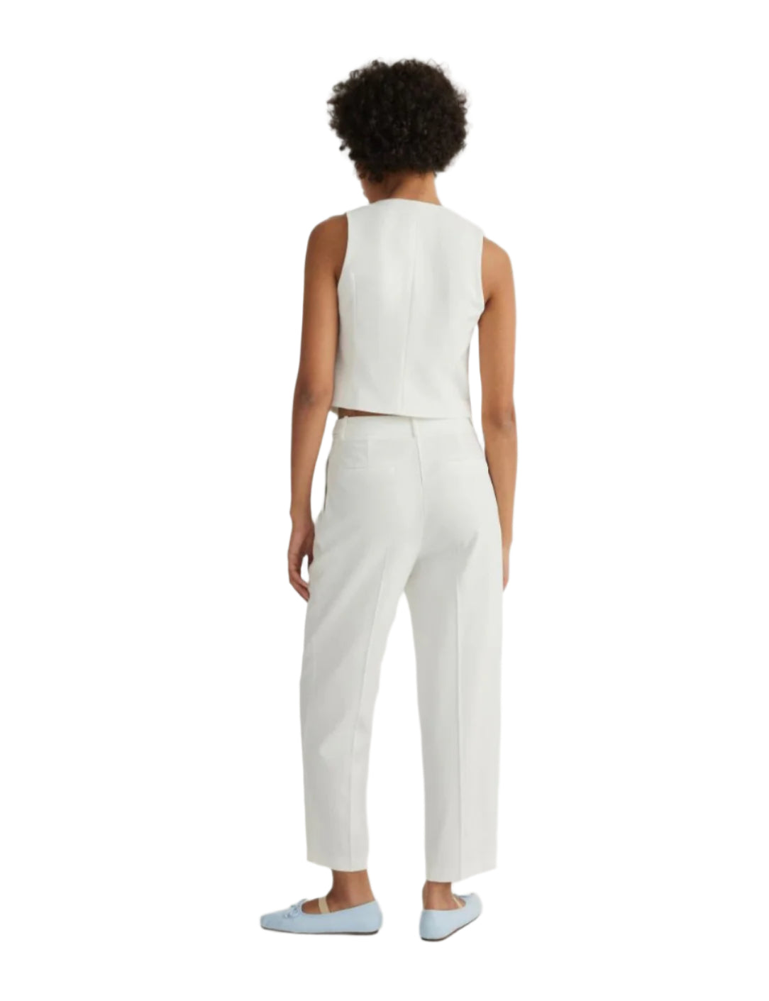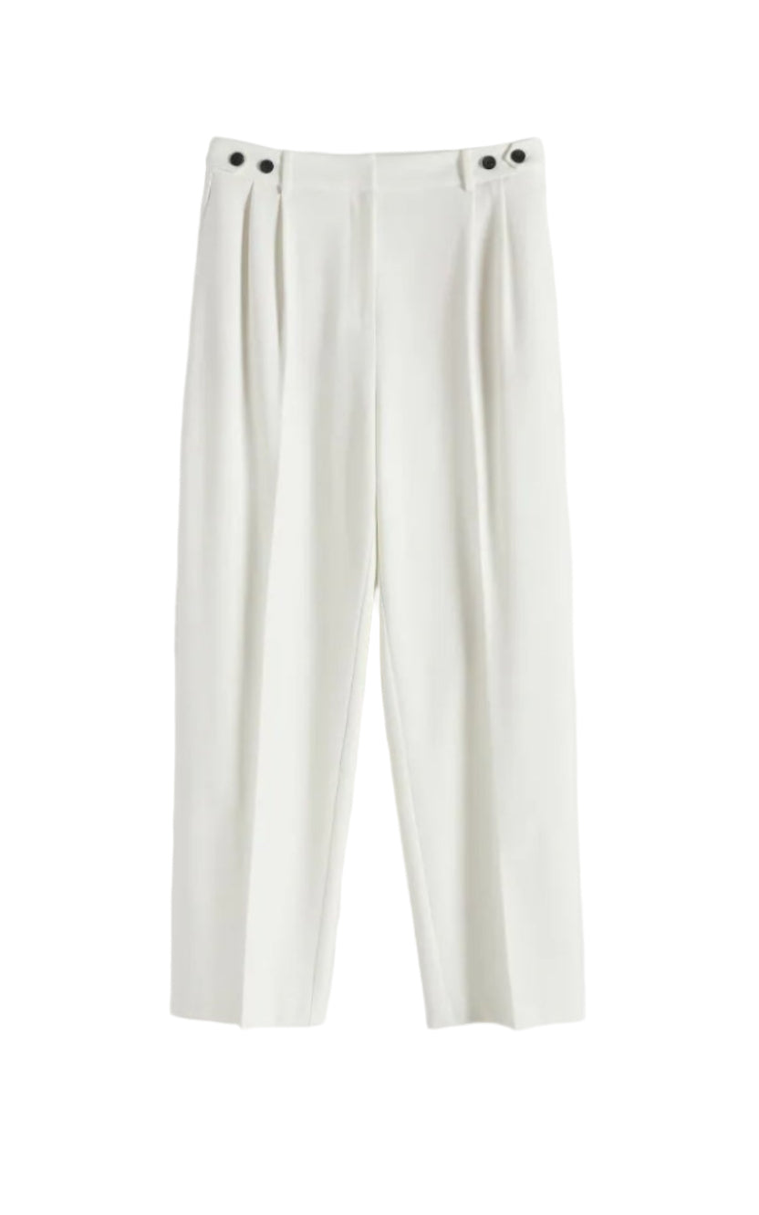 Címke nélküli, ekrü színű, elegáns szivarnadrág, élére vasalt kialakítással. Magas derekú szabás, díszgombos részletek a derékrészen, és laza, egyenes szárú fazon. Kényelmes és stílusos viselet alkalmi vagy irodai megjelenéshez.