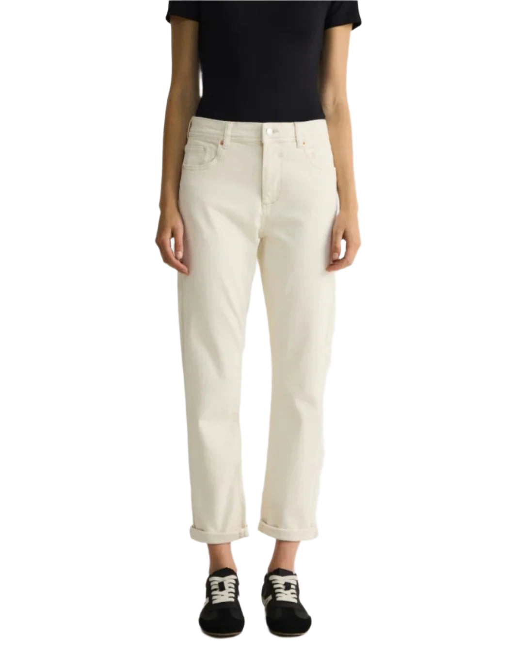 Címke nélküli, ekrü színű boyfriend farmer, lazább szabással és visszahajtható szárvéggel. Klasszikus ötzsebes kialakítás, gombos és cipzáras záródással. Kényelmes, mégis stílusos viselet a mindennapokra.