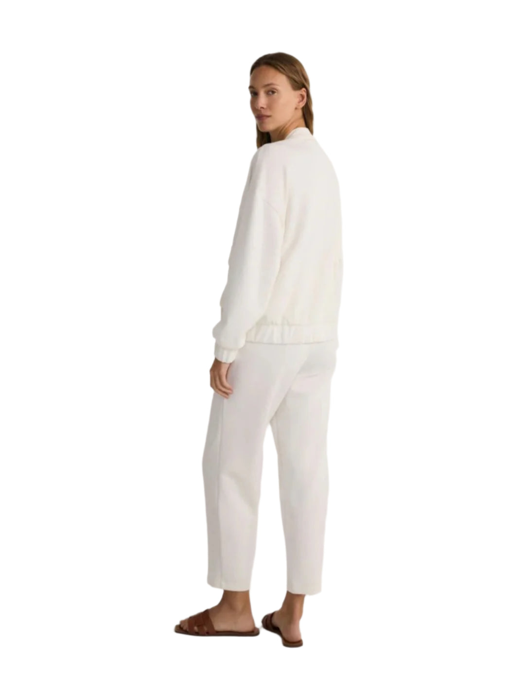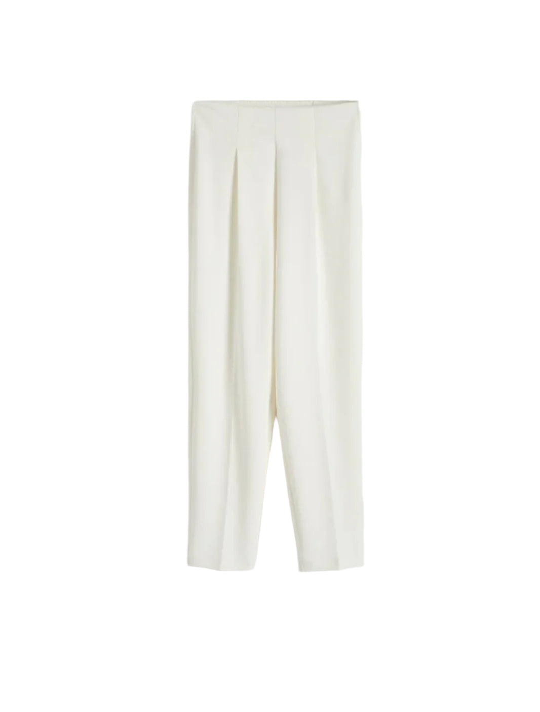 Címke nélküli, fehér színű női nadrág, bő szabású, magas derékkal és redőzött részletekkel. Kényelmes és elegáns viselet alkalmi vagy irodai megjelenéshez.