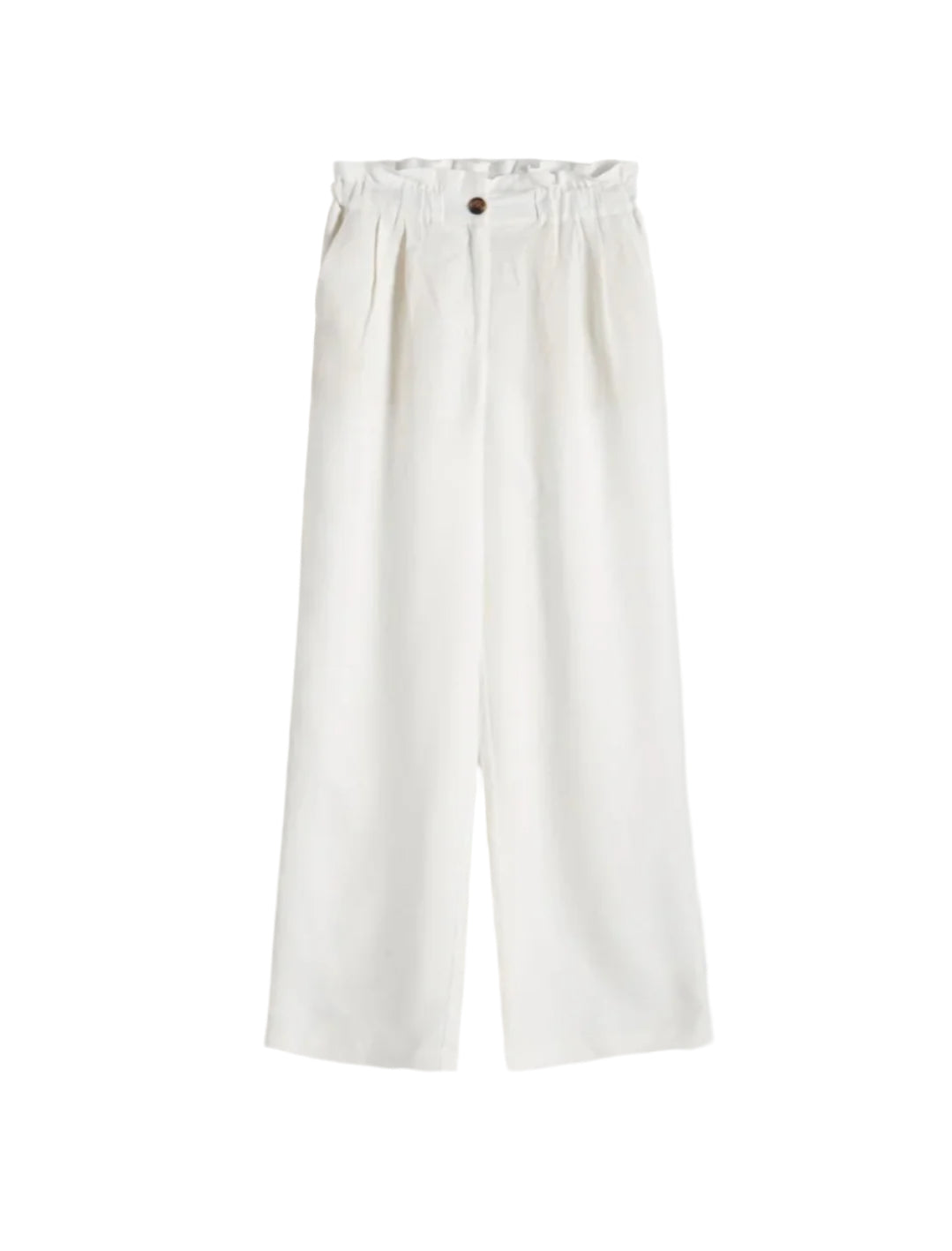 Címke nélküli, fehér színű, könnyed anyagú nadrág. Bő szárú fazon kényelmes, légies viseletet biztosít. Derékrésze gumírozott fodros kialakítással, elöl gombos és cipzáras záródással. Tökéletes választás elegáns és hétköznapi viselethez egyaránt.