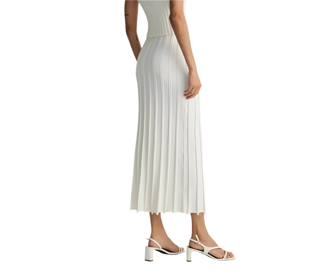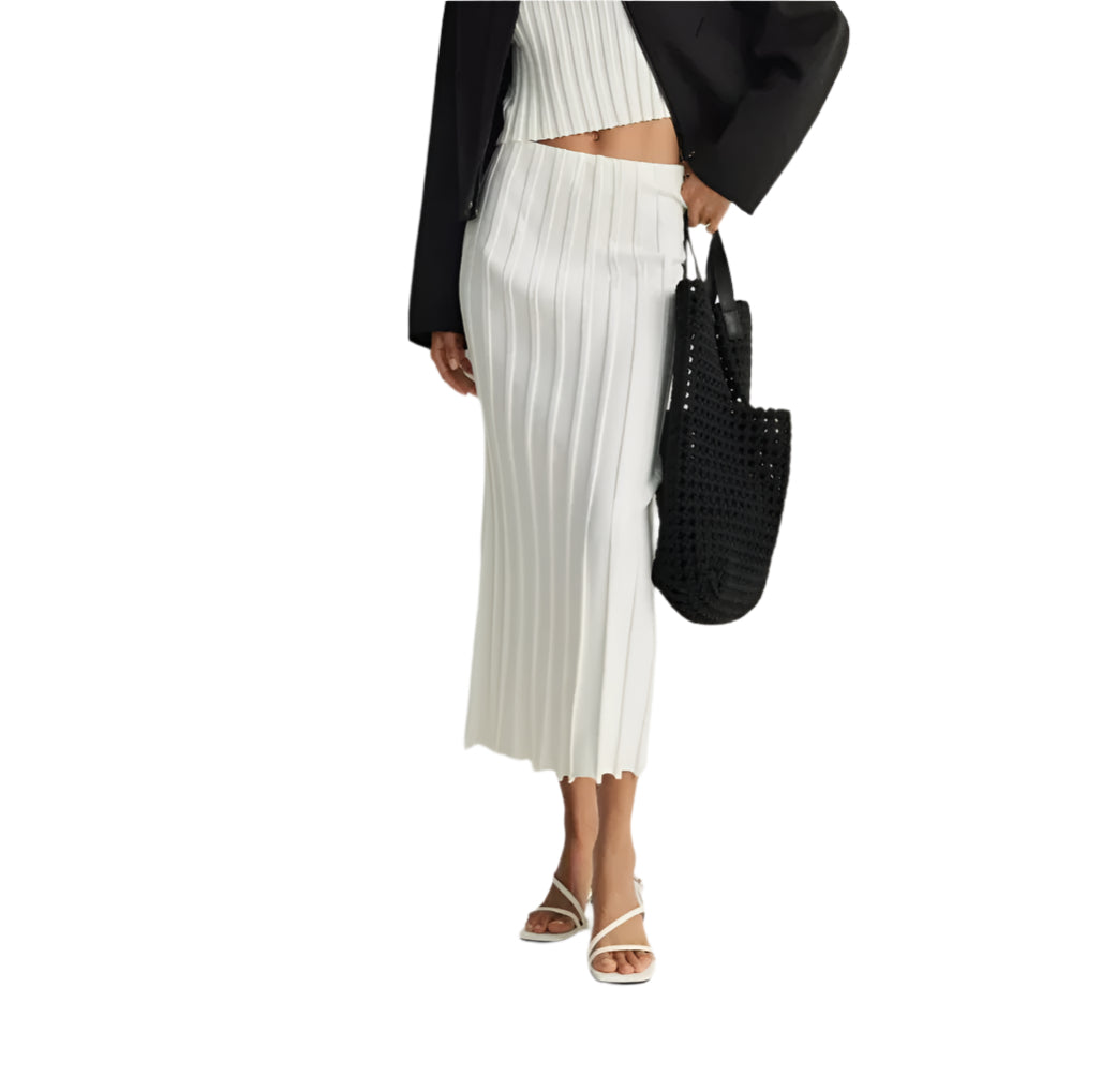 Címke nélküli, elegáns fehér bordázott midi szoknya. Testhezálló szabása kiemeli az alakot, míg rugalmas anyaga kényelmes viseletet biztosít. A letisztult dizájn és a hosszanti bordázás optikailag nyújtja a sziluettet. Tökéletes választás elegáns és hétköznapi összeállításokhoz egyaránt.