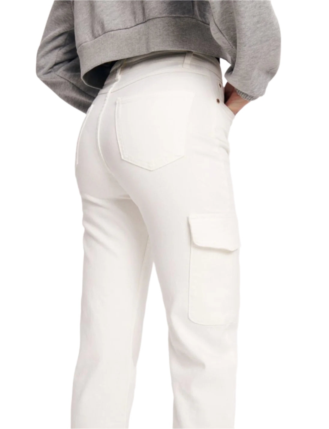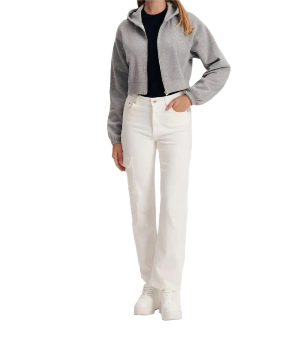 Címke nélküli, fehér színű cargo farmer nadrág, egyenes szárú fazon, oldalzseb részlettel és klasszikus cipzáras-gombos rögzítéssel. Kényelmes és trendi viselet a hétköznapokra.