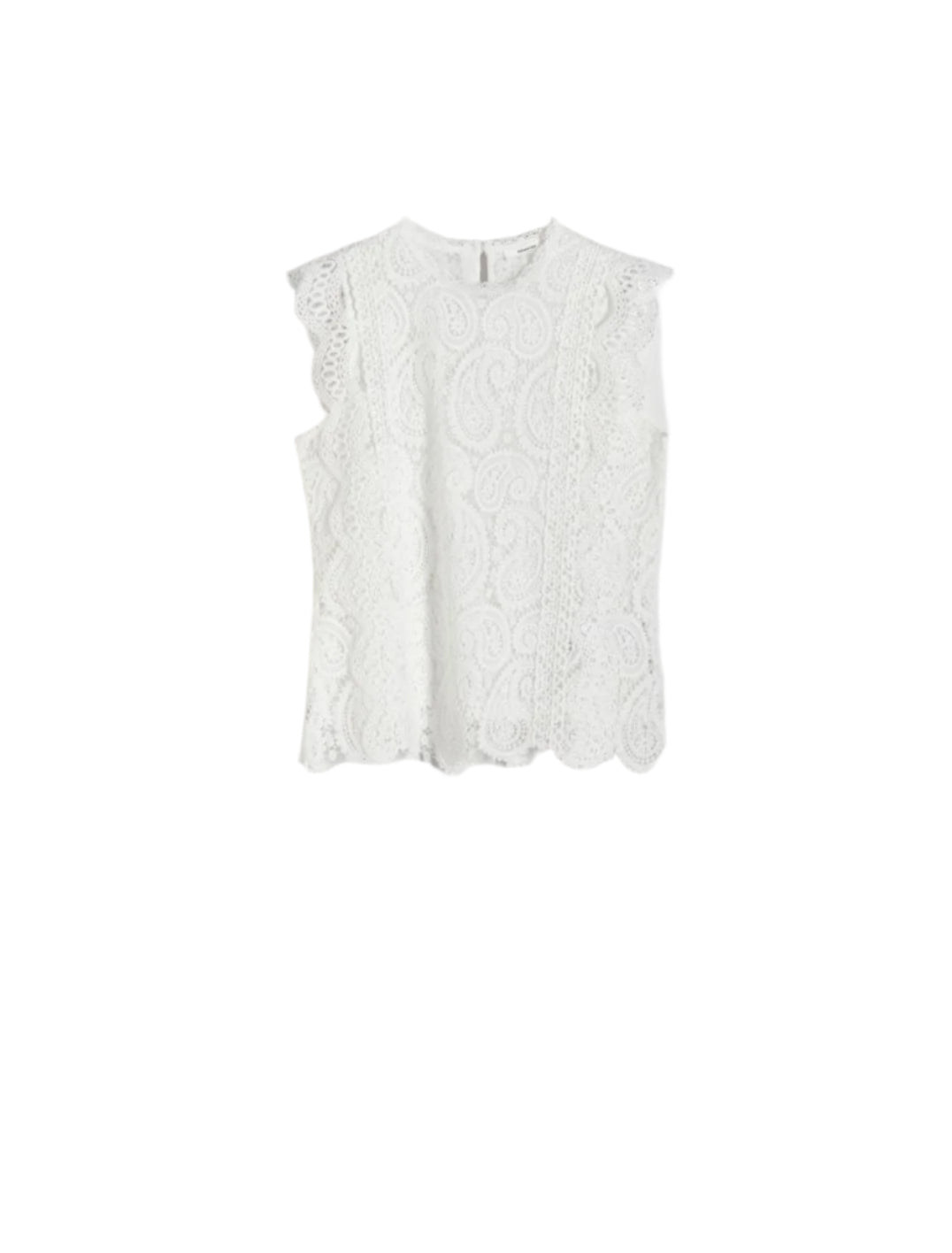 Címke nélküli, fehér csipkés ujjatlan felső. Finom kidolgozású csipkemintával díszített, romantikus és elegáns megjelenést kölcsönöz. Magas nyakkivágás és enyhén fodros vállrész teszi különlegessé. Hátul gombos záródással rendelkezik. Ideális választás alkalmi és hétköznapi viseletre egyaránt.