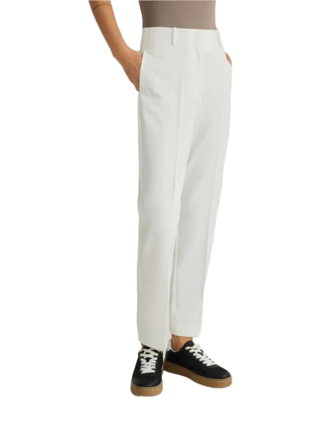 Címke nélküli, fehér színű, elegáns nadrág. Egyenes szabású fazonja és letisztult vonalvezetése modern és sokoldalú viseletet biztosít. Magas derekú kialakítása kényelmes illeszkedést nyújt, övbújtatós dereka pedig variálható stílust tesz lehetővé. Ideális választás irodai, alkalmi vagy hétköznapi outfitekhez.