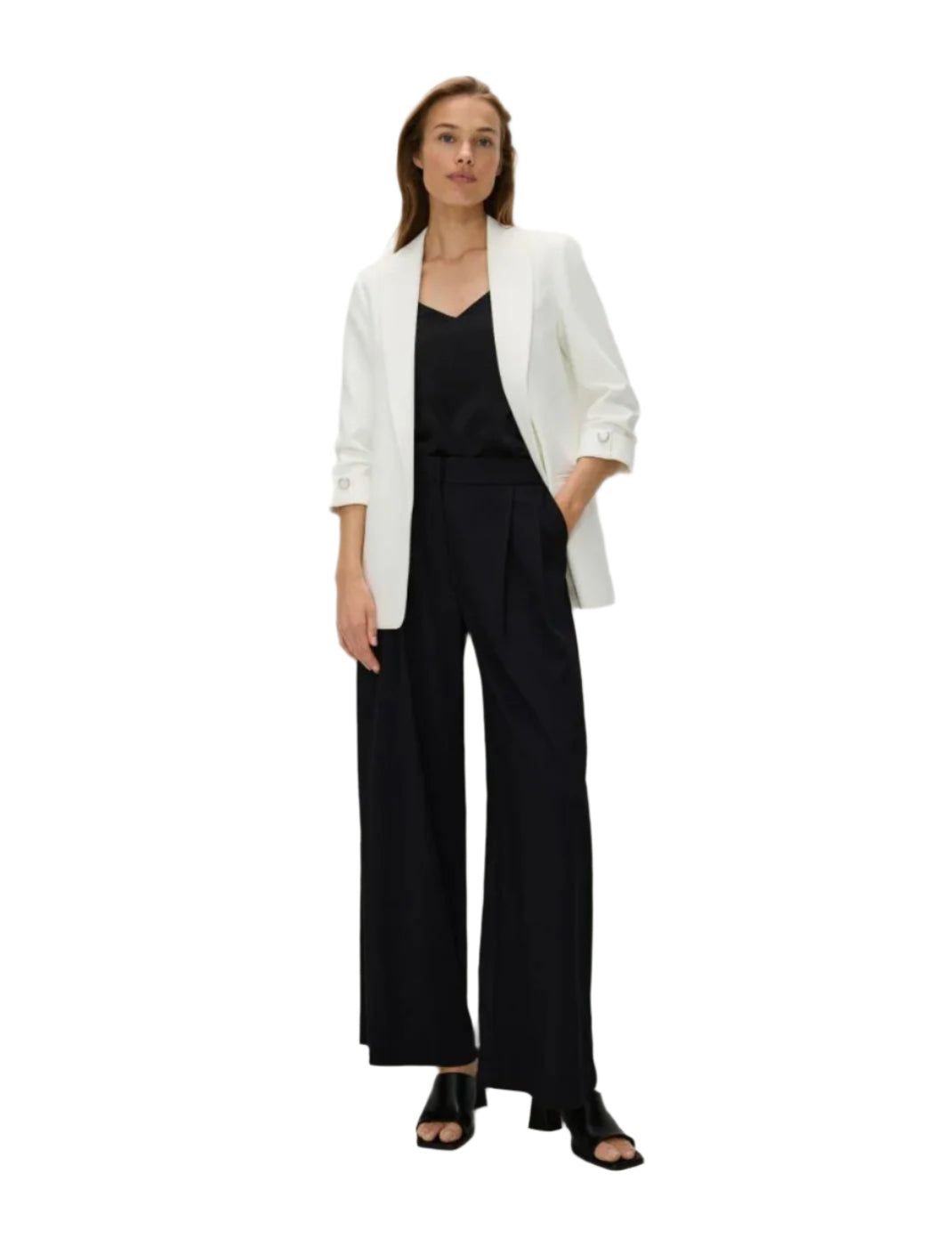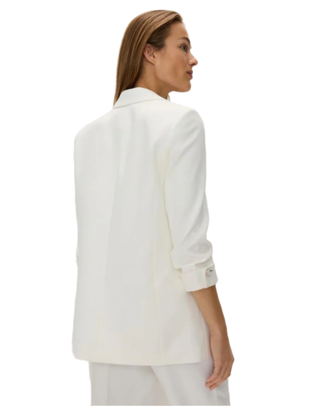 Címke nélküli, fehér színű, elegáns szabású blézer letisztult és modern megjelenést biztosít. Karcsúsított fazonja és 3/4-es ujján található gombos részletek kifinomult stílust kölcsönöznek. Kényelmes, könnyed anyaga tökéletes választás irodai vagy alkalmi viselethez.
