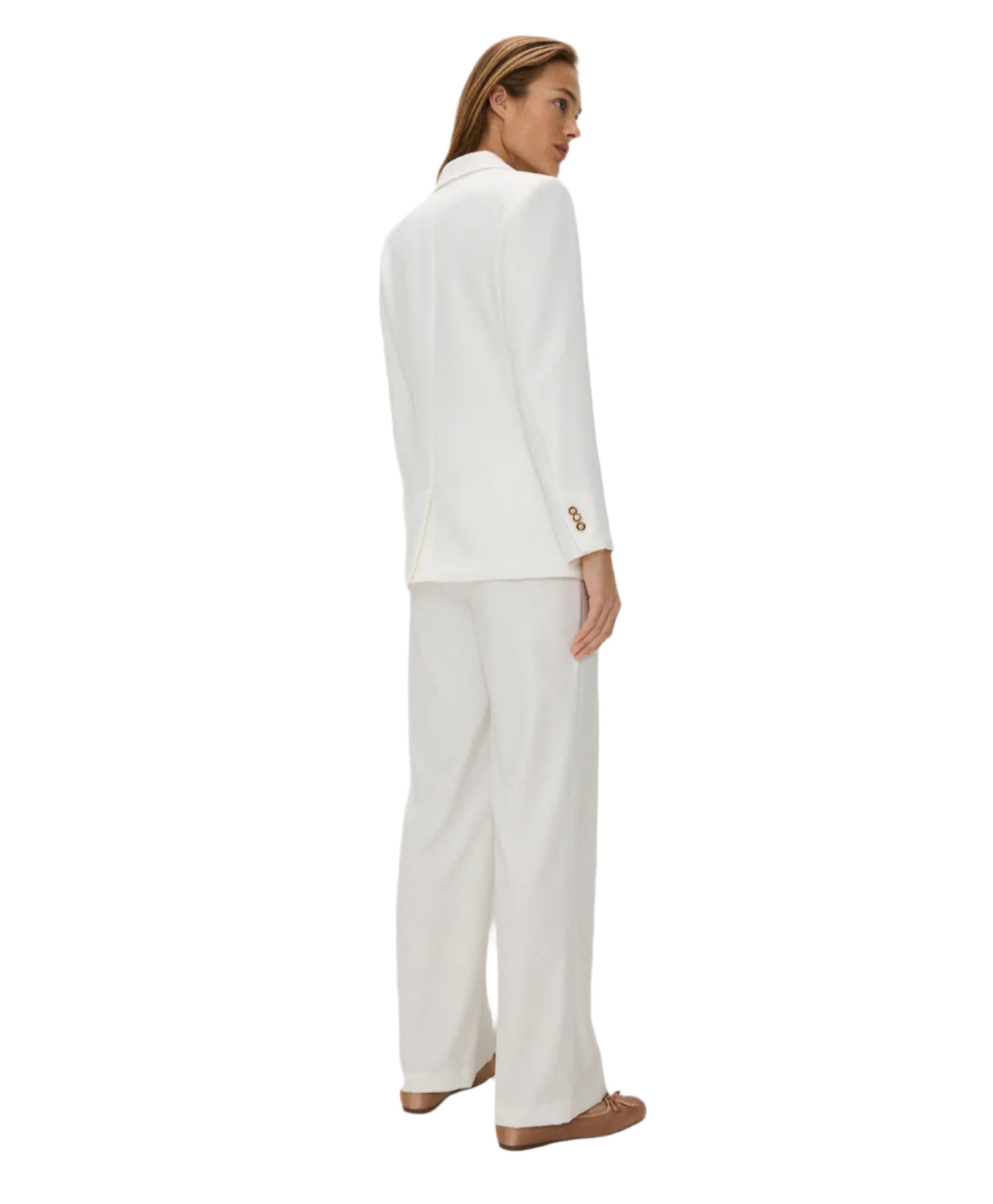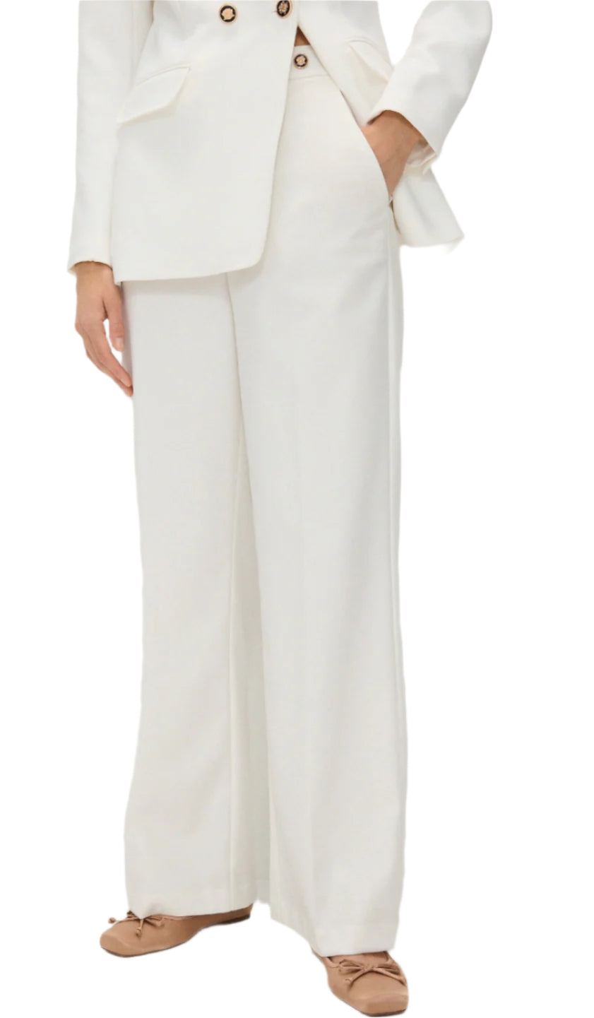 Címke nélküli, elegáns fehér színű nadrág. Magas derekú, bő szárú fazon, amely tökéletes választás irodai vagy alkalmi viselethez. Elöl élére vasalt szabásvonallal és klasszikus cipzáras-gombos záródással rendelkezik. Stílusos megjelenést biztosít blézerekkel és finom kiegészítőkkel kombinálva.