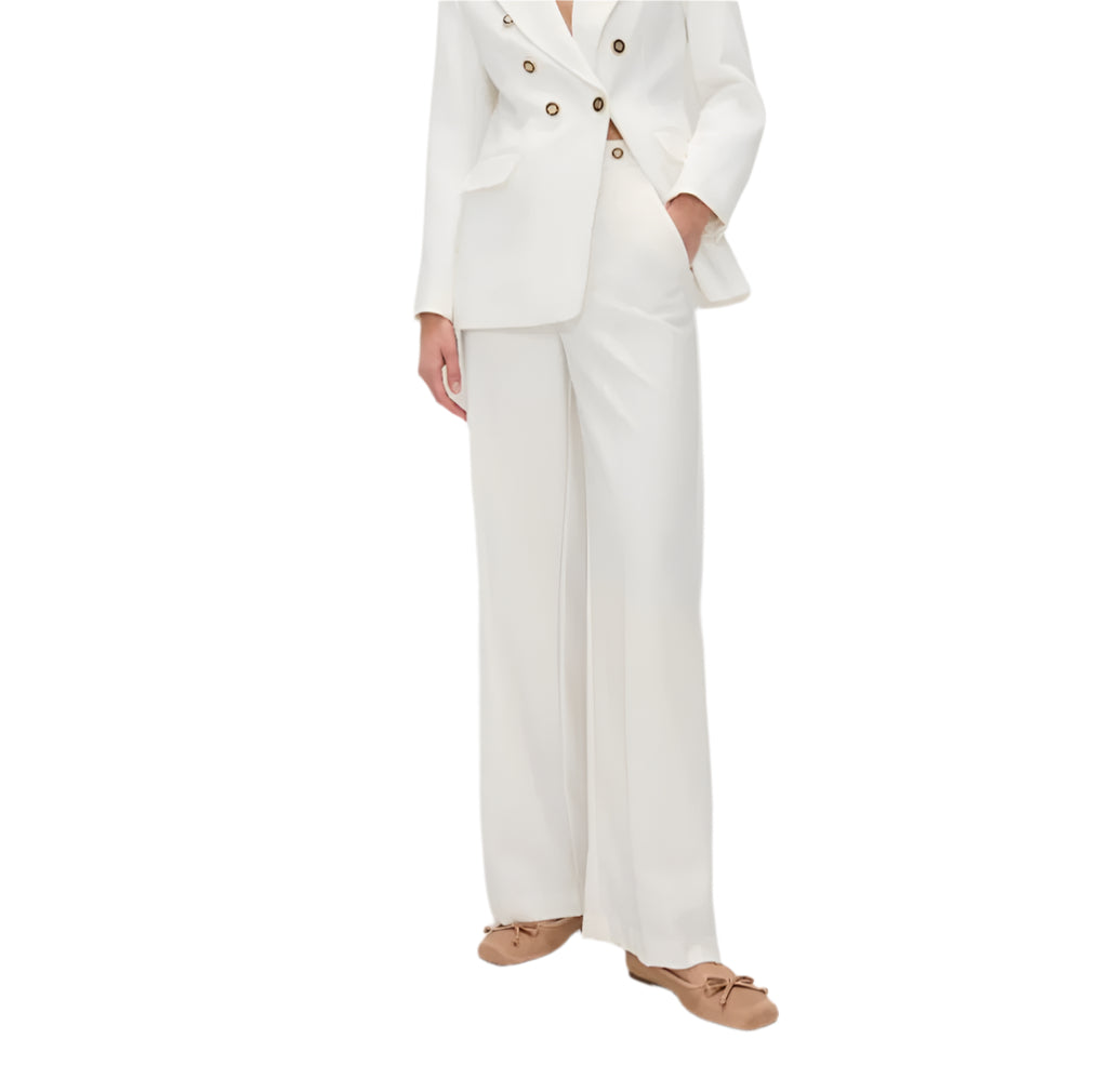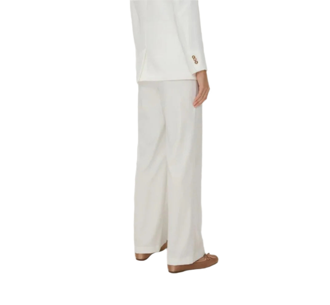 Címke nélküli, fehér színű, elegáns bő szárú nadrág. Magas derekú kialakítása kihangsúlyozza az alakot, míg a finom esésű anyaga légies és elegáns megjelenést biztosít. Tökéletes választás alkalmi és üzleti viselethez egyaránt. Könnyedén kombinálható blézerrel vagy elegáns felsőkkel.