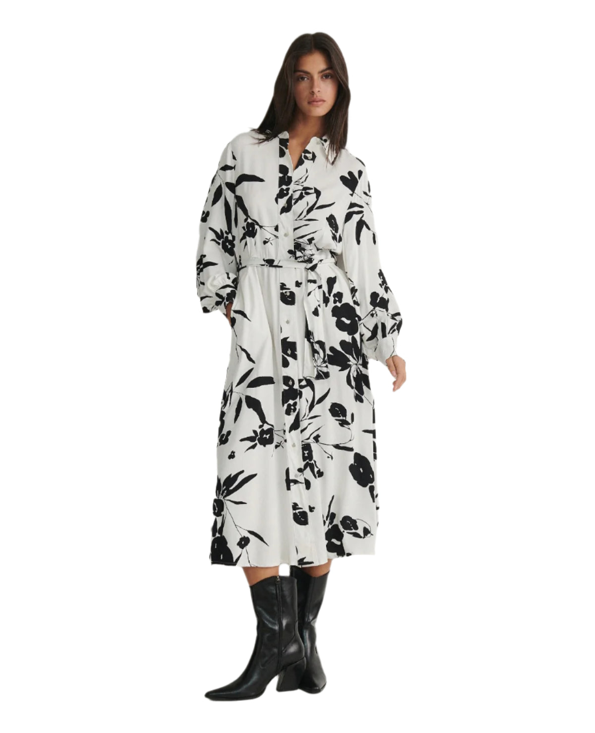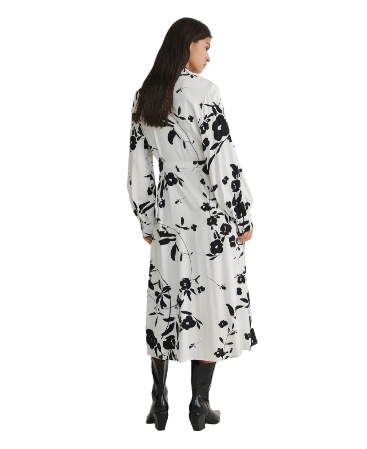 Címke nélküli, női ingruha, fehér alapon fekete virágmintával, hosszú ujjú, midi hosszúságú, gombos záródású, megkötős derékrésszel, elegáns és kényelmes viselet mindennapokra vagy alkalmi öltözetként.