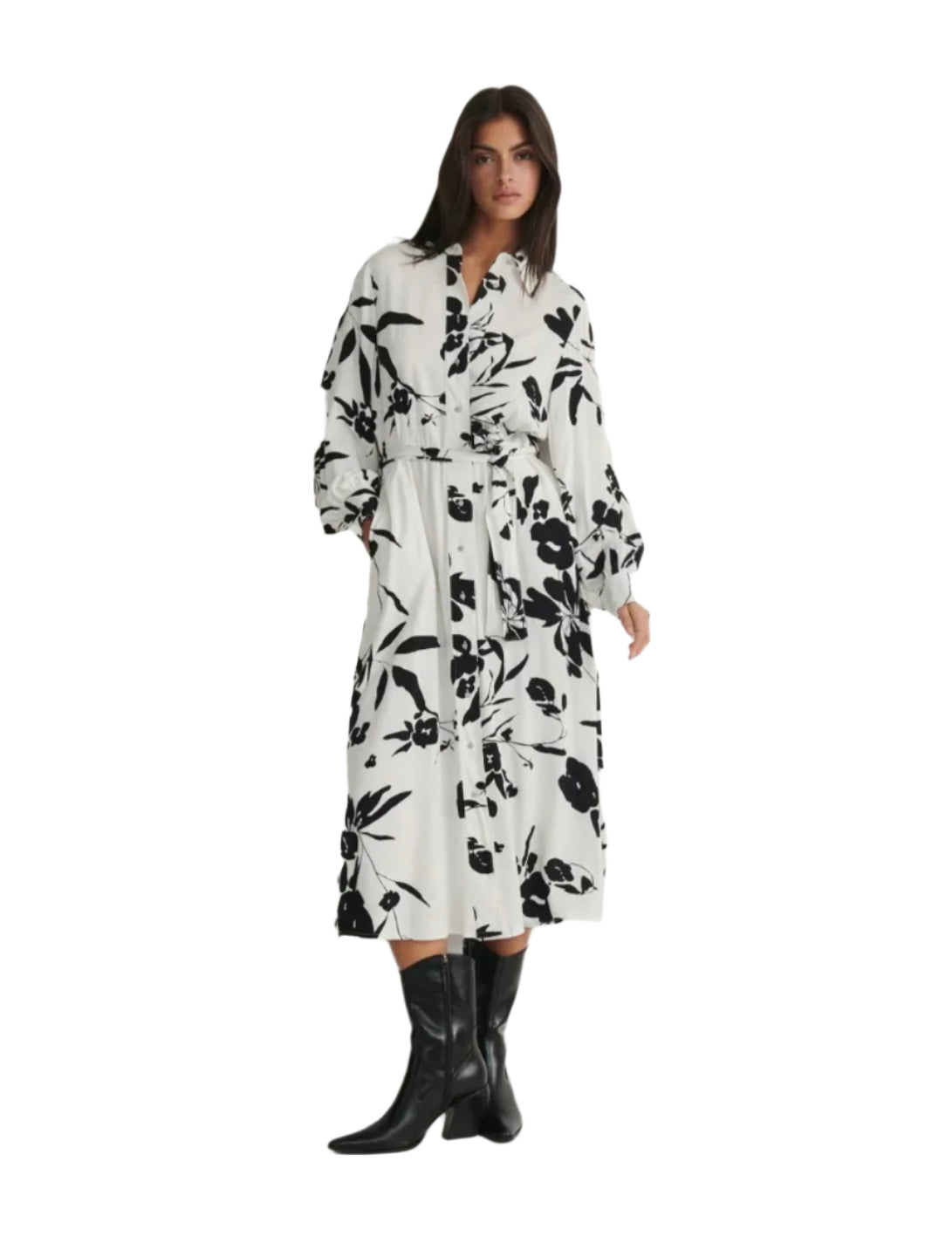 Címke nélküli, elegáns fehér ingruha fekete virágmintás dizájnnal. Hosszú ujjú, gombos elülső résszel és klasszikus gallérral. Derékhangsúlyos szabás levehető övvel, amely kiemeli az alakot. Midi hosszúságú, lezser és elegáns viselet, amely alkalmi és hétköznapi outfitekhez is tökéletes választás.