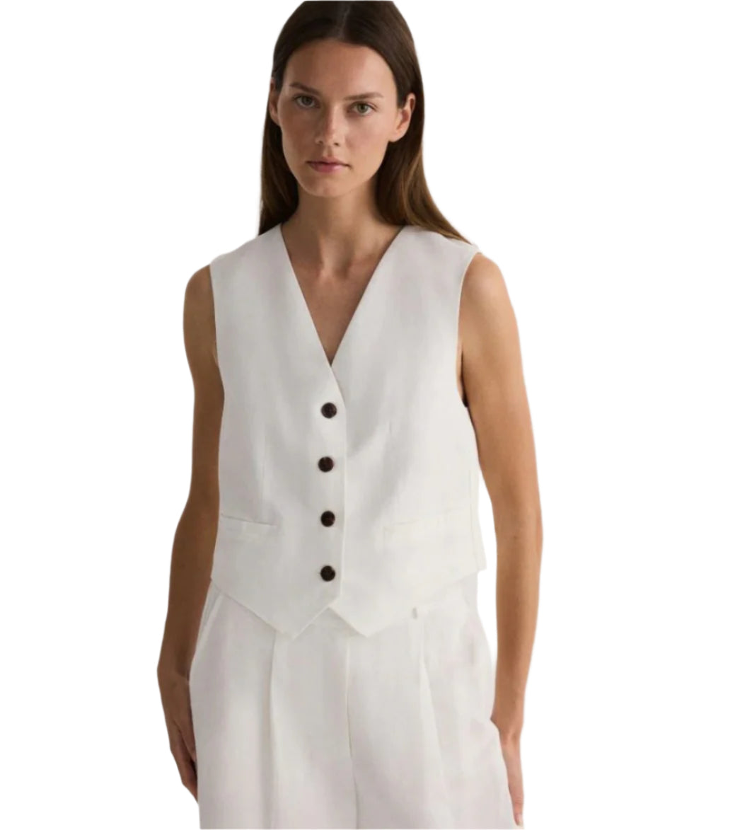 Címke nélküli, elegáns fehér mellény klasszikus gombos záródással. Karcsúsított szabása kiemeli az alakot, míg a V-kivágás és az apró elülső zsebek kifinomult megjelenést kölcsönöznek. Ideális választás rétegezéshez, vagy önállóan viselve egy letisztult, modern outfit részeként.