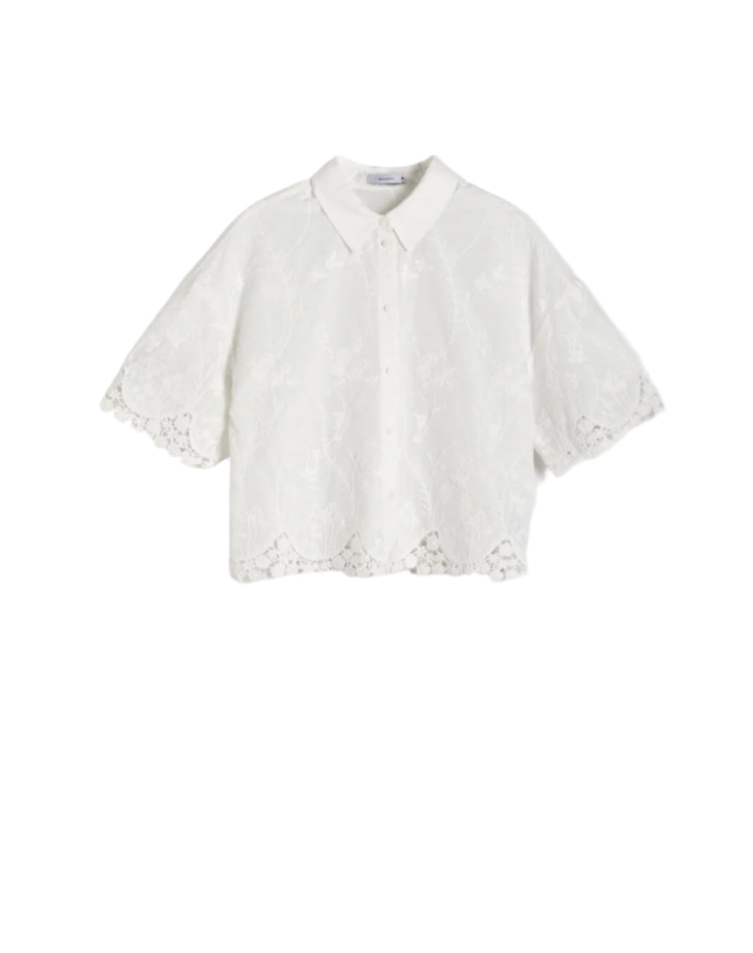 Címke nélküli, elegáns fehér blúz finom hímzett csipkével és gombos elülső résszel. Rövid ujjú, galléros kialakítással és díszes szegéllyel az ujjak és a blúz alján. Romantikus, nőies darab, amely tökéletes választás alkalmi és hétköznapi viselethez egyaránt.
