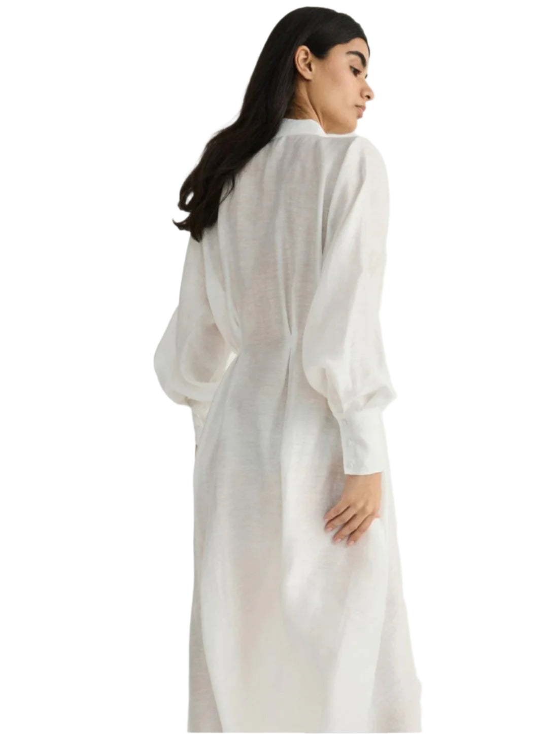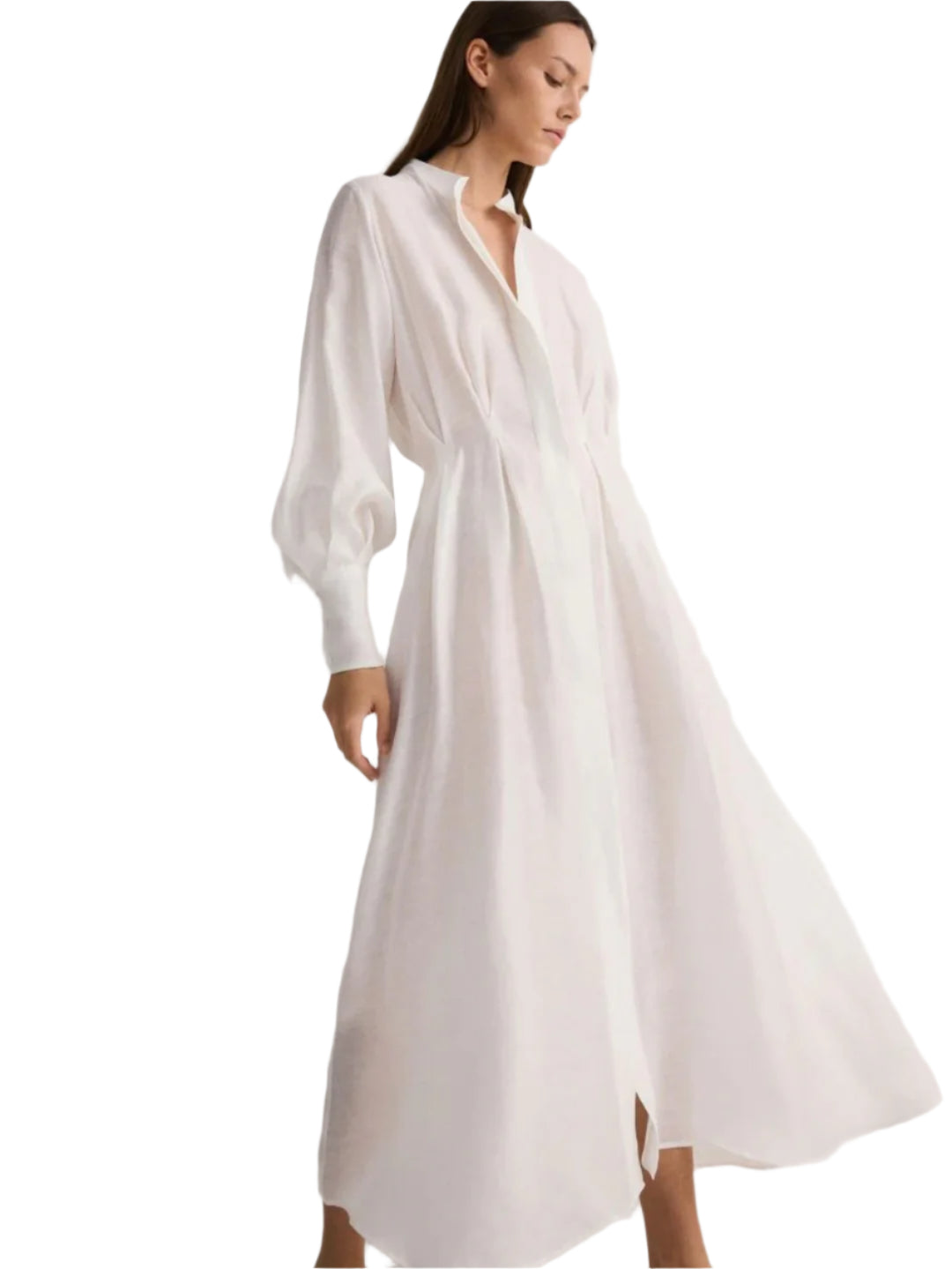 Címke nélküli, elegáns fehér midi ruha, könnyed és légies anyagból. Hosszú, puffos ujjak mandzsettával, V-kivágású galléros nyakrész és derékhangsúlyos szabás teszi különlegessé. Lágy esésű szoknyarésszel és finom nőies vonalvezetéssel ideális választás alkalmi vagy elegáns hétköznapi viseletre.