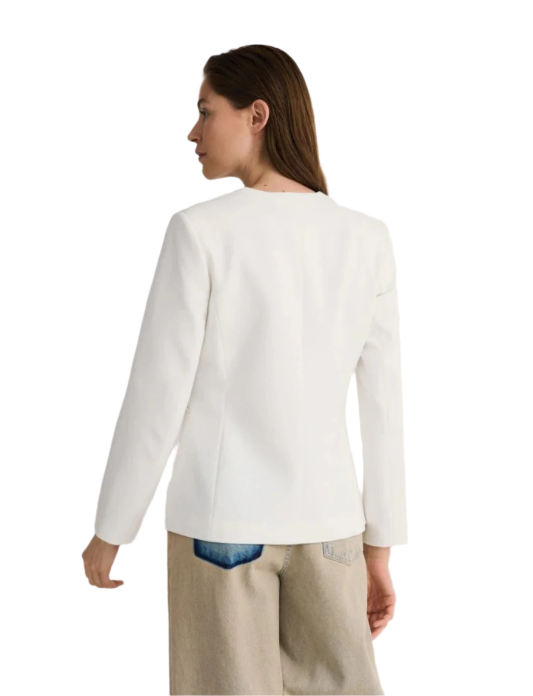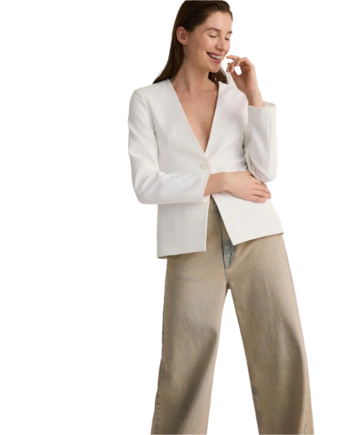 Címke nélküli, fehér, elegáns blézer minimalista egygombos záródással. Karcsúsított szabású, letisztult vonalvezetésű, amely modern és nőies megjelenést kölcsönöz. Alkalmas üzleti viseletként, elegáns eseményekre vagy divatos hétköznapi outfithez.