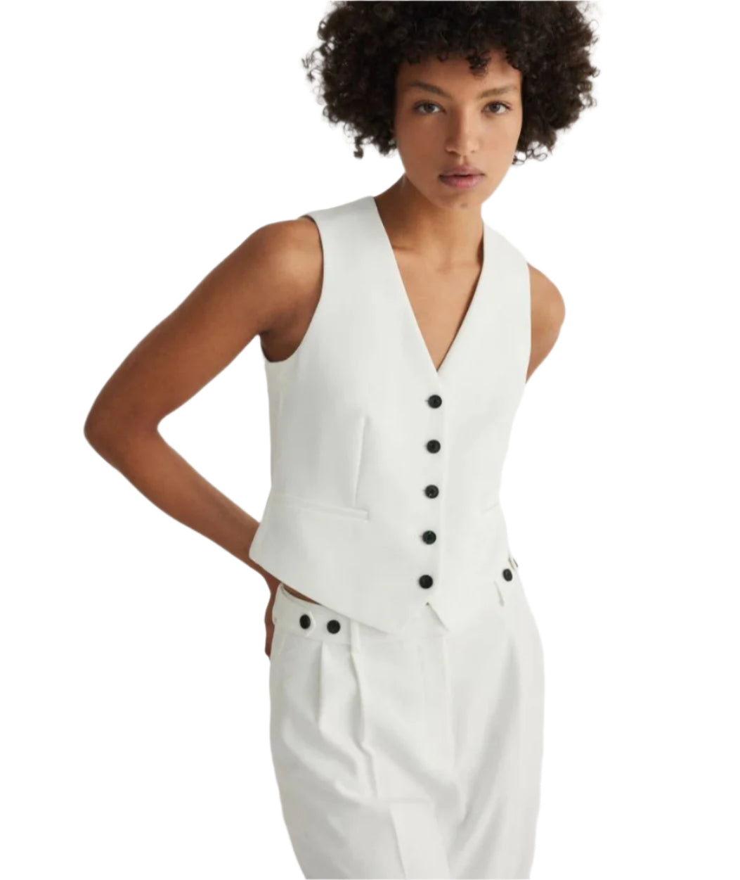 Címke nélküli, elegáns fehér mellény kontrasztos fekete gombokkal. Karcsúsított szabása és V-kivágása modern és letisztult megjelenést biztosít. Klasszikus fazonja miatt könnyen kombinálható inggel vagy önállóan viselve. Ideális választás elegáns és hétköznapi szettekhez egyaránt.
