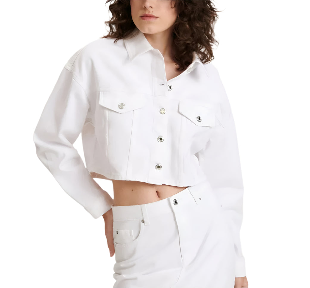 Címke nélküli, fehér színű rövidített fazonú farmerkabát. Kiváló minőségű pamut anyagból készült, amely kényelmes és légáteresztő viseletet biztosít. Elöl gombos záródással és két mellzsebbel rendelkezik, klasszikus galléros kialakítással. Modern és trendi megjelenést kölcsönöz, tökéletes kiegészítője a hétköznapi és alkalmi outfiteknek egyaránt.