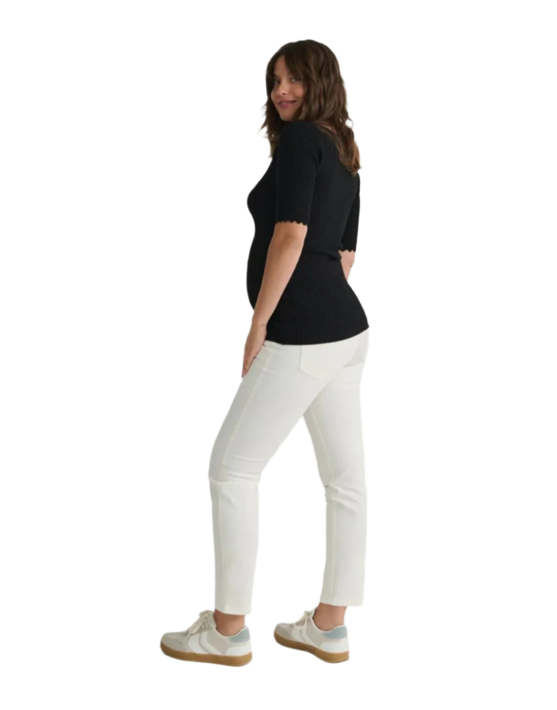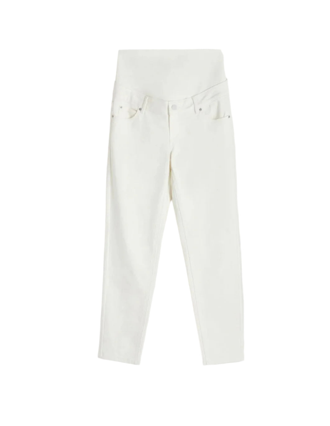 Címke nélküli, fehér színű kismama farmer. Puha, rugalmas anyagból készült, amely kényelmet biztosít a várandósság ideje alatt. Magas, elasztikus derékrésze tökéletesen illeszkedik a növekvő pocakhoz. Klasszikus öt zsebes fazonja modern megjelenést kölcsönöz. Ideális választás mindennapi viseletre, amely stílust és kényelmet nyújt egyszerre.