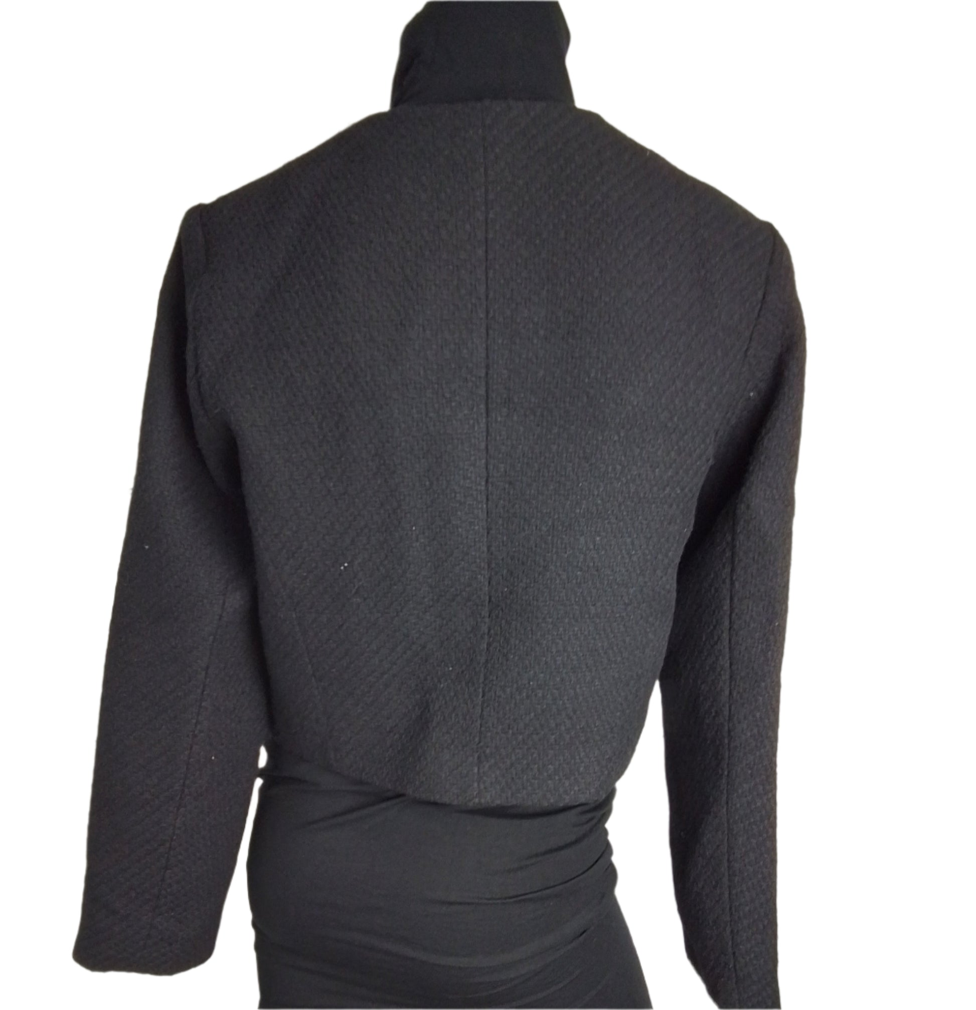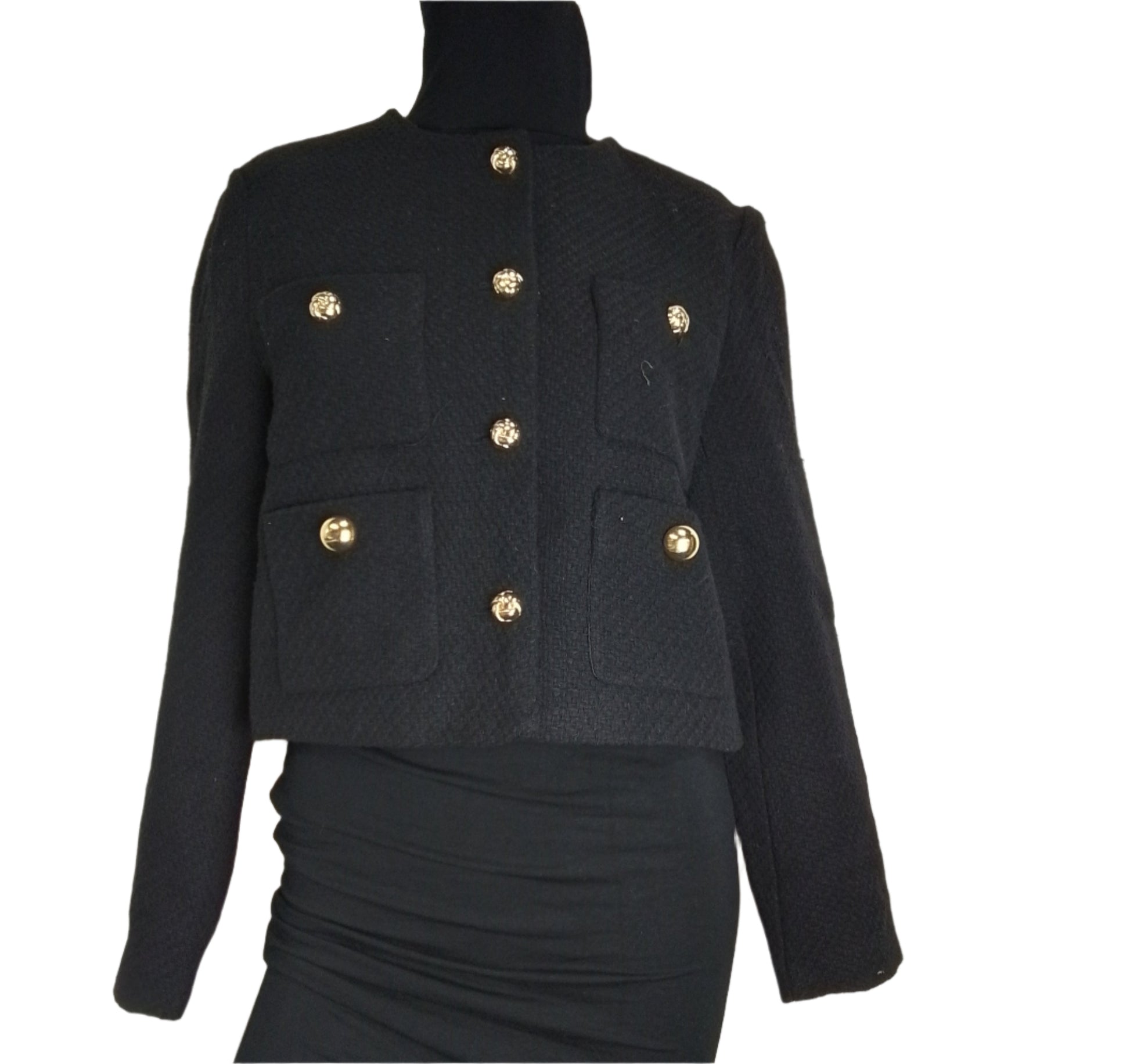 Címke nélküli, elegáns fekete blézer klasszikus, strukturált szabással. Elöl aranyszínű gombokkal díszített, amelyek exkluzív megjelenést kölcsönöznek. Négy praktikus zsebbel ellátott, rövid fazonja tökéletes választás alkalmi és hétköznapi viselethez egyaránt.