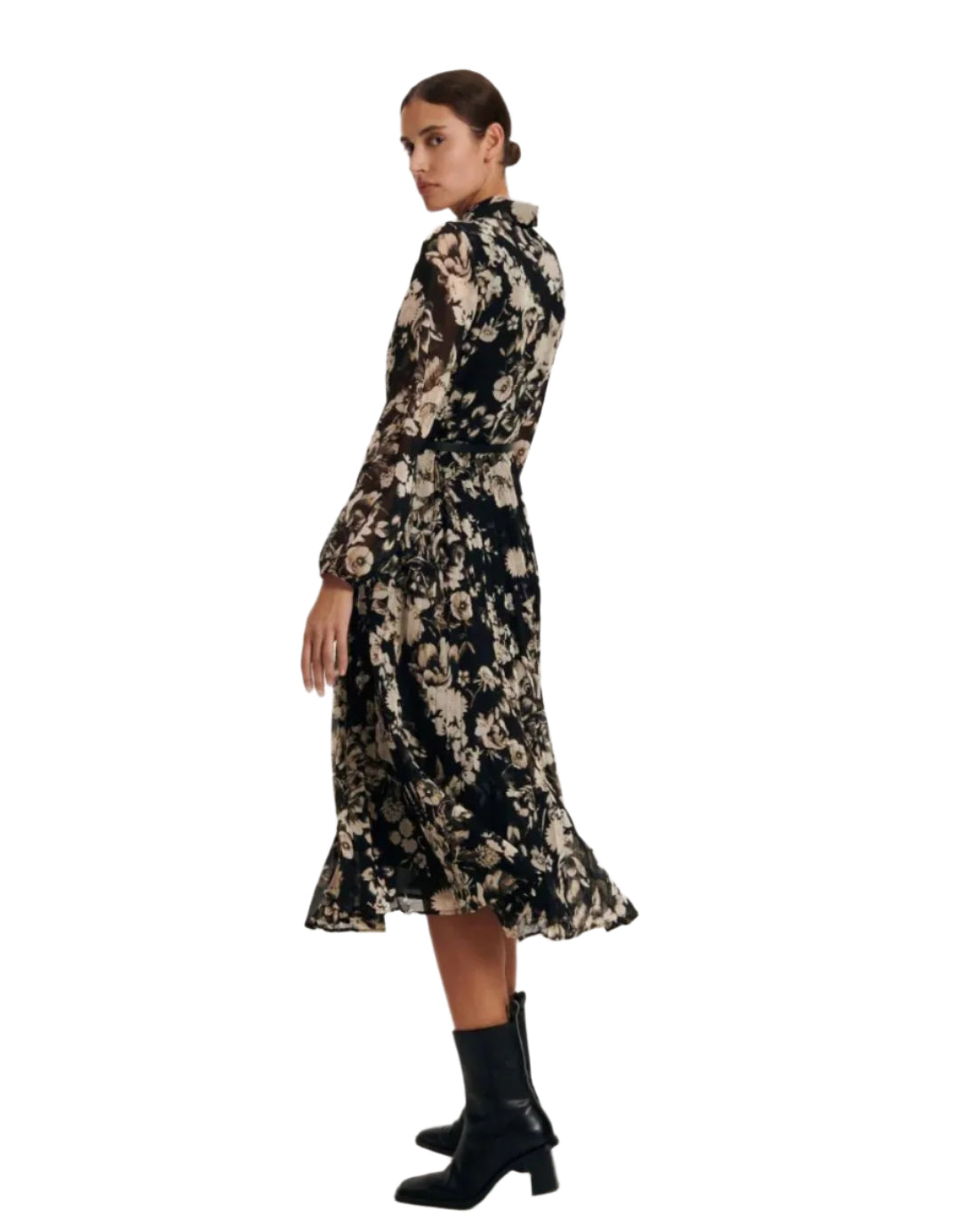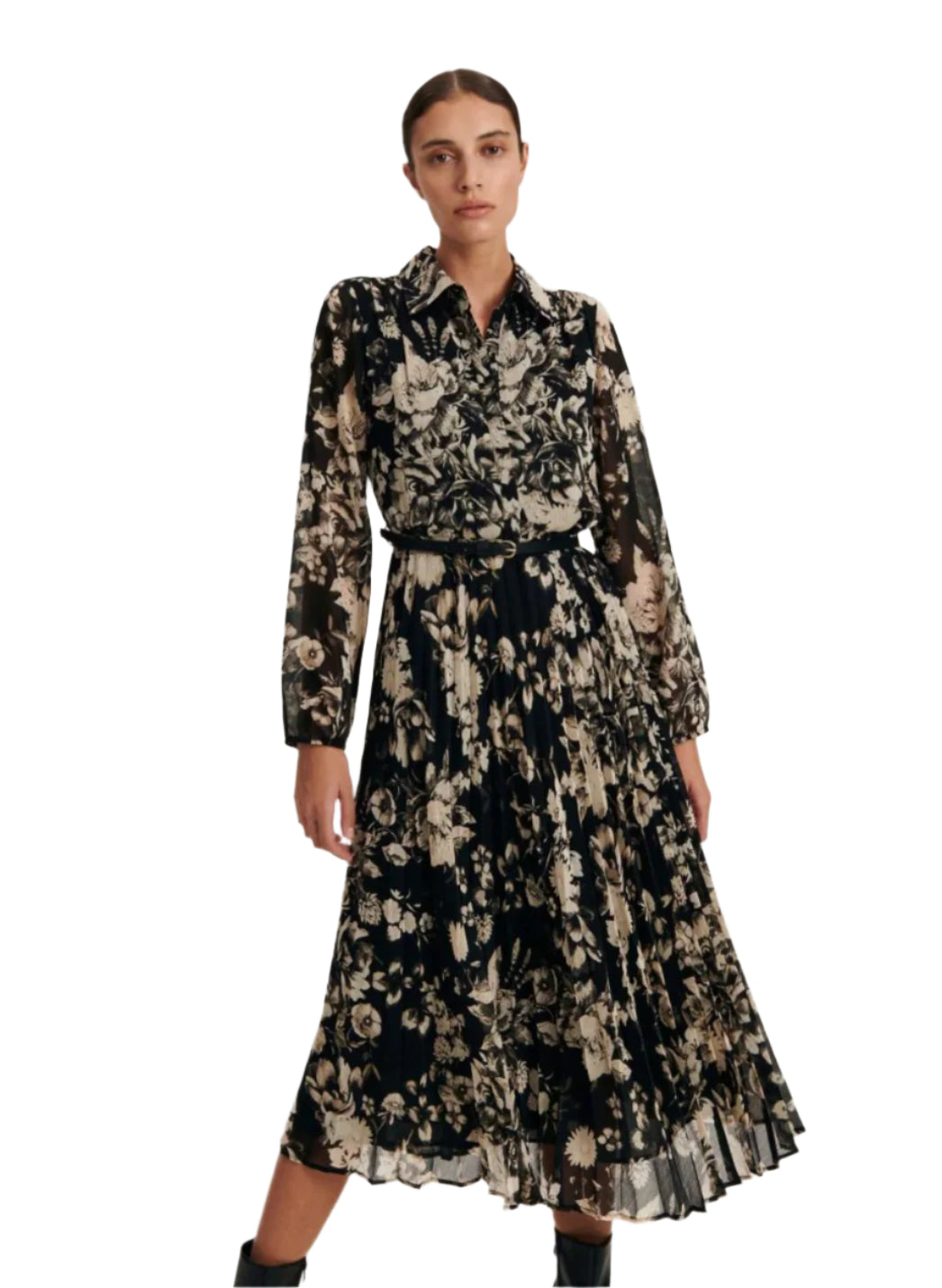 Címke nélküli, női midi ingruha, fekete alapon bézs virágmintával, hosszú ujjú, gombos záródású, derékhangsúlyos szabással, pliszírozott szoknyarésszel, elegáns és kifinomult viselet különleges alkalmakra vagy elegáns hétköznapi megjelenéshez.