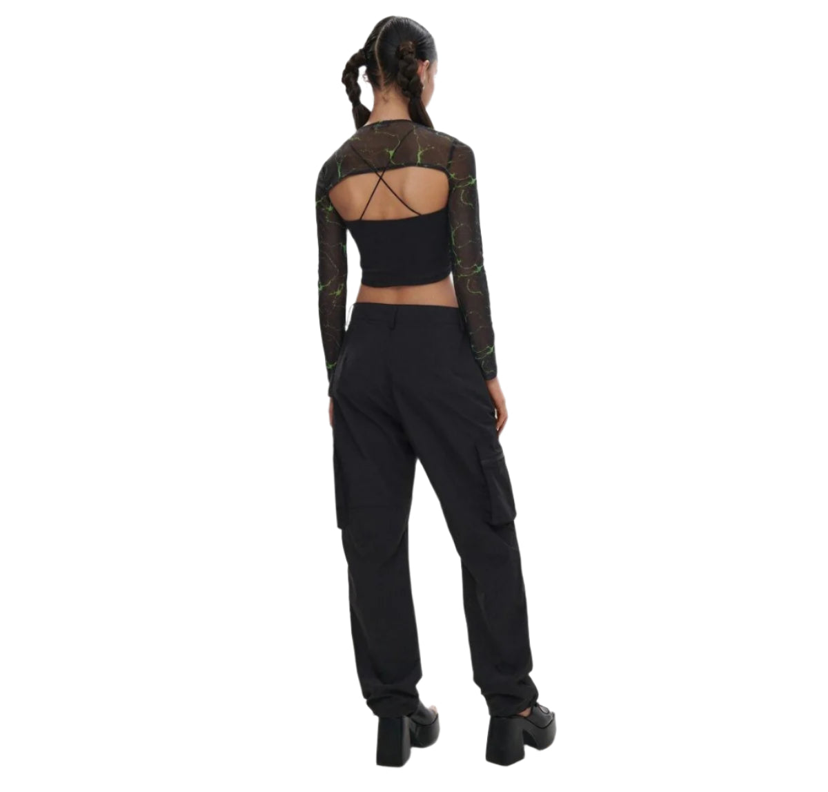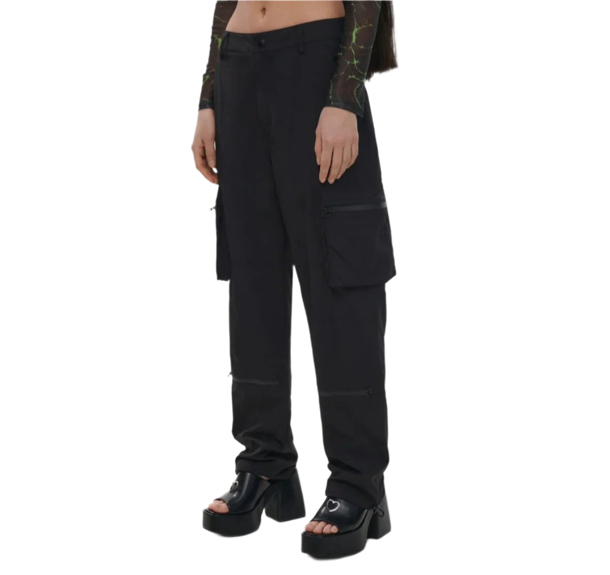 Címke nélküli, női cargo nadrág, fekete színű, magas derekú, bő szárú fazon, több zsebes kialakítással, cipzáras és gombos záródással, modern és vagány stílus hétköznapi viselethez.