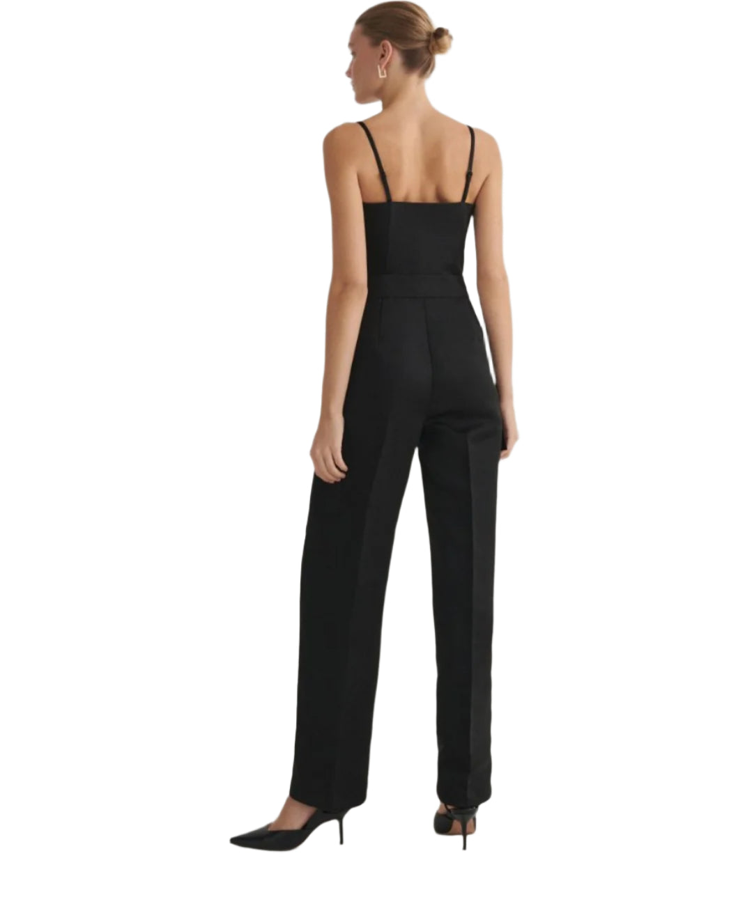 Címke nélküli, fekete színű elegáns overál állítható vékony pántokkal és egyenes szabású, hosszú nadrágrésszel. Magasított derékrészének köszönhetően kiemeli az alakot, míg letisztult dizájnja elegáns megjelenést biztosít. Tökéletes választás különleges alkalmakra vagy üzleti viseletként is.