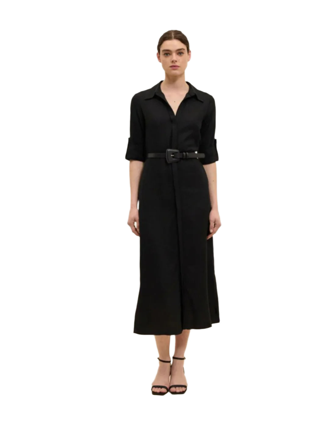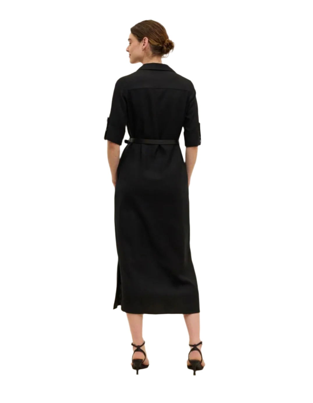 Címke nélküli, klasszikus fekete ingruha elegáns, letisztult szabással. Hosszú, egyenes fazonú, derékövvel kiegészítve, amely kiemeli az alakot. Galléros nyakkivágás és háromnegyedes ujjhossz teszi tökéletes választássá irodai viselethez vagy alkalmi megjelenéshez. Könnyed és kényelmes anyagának köszönhetően egész napos viseletre is ideális.