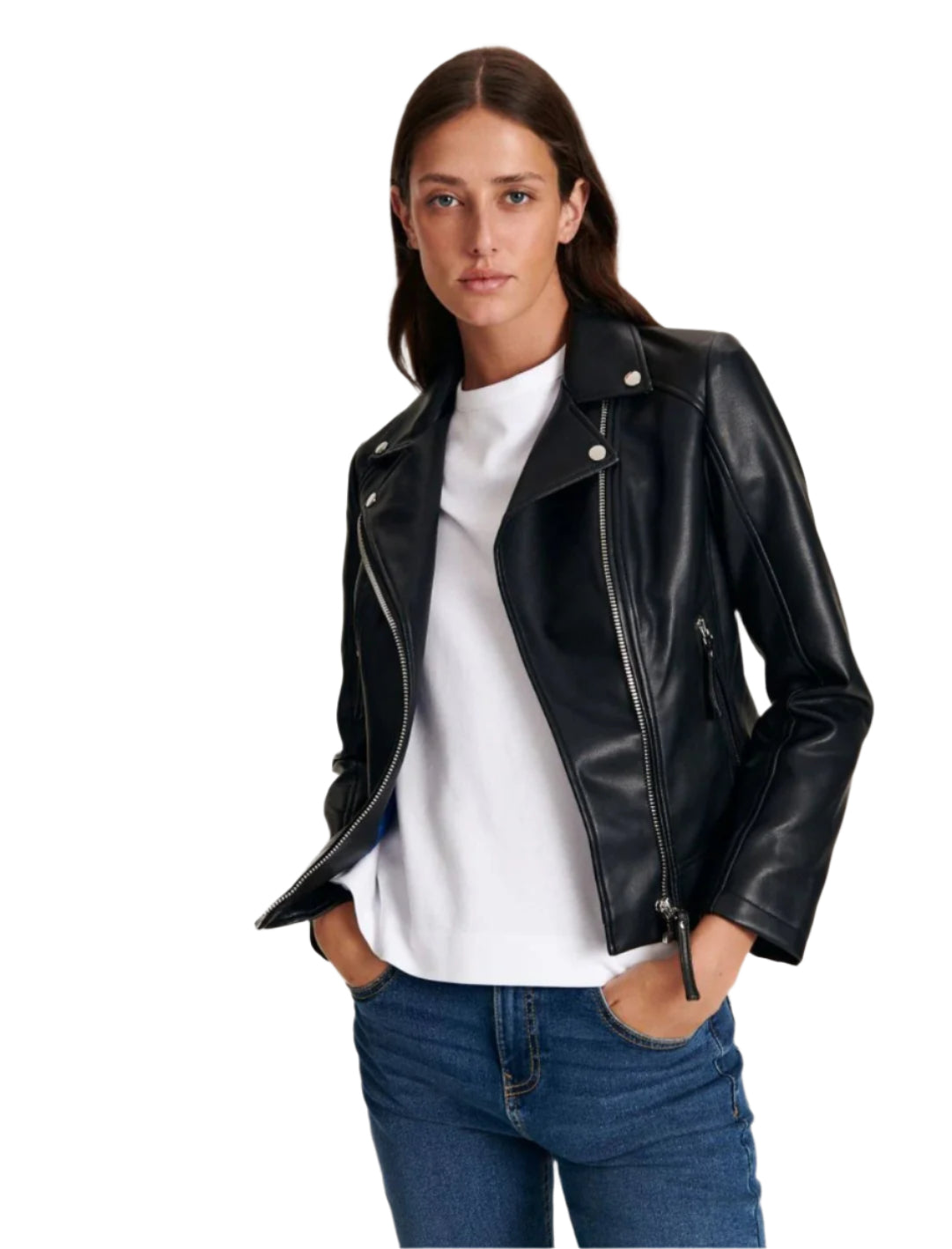 Címke nélküli, fekete műbőr motoros kabát. Klasszikus biker stílusú kialakítás ferde cipzárral és gallérral, szegecsekkel díszítve. Karcsúsított fazonja kiemeli az alakot, miközben kényelmes viseletet biztosít. Két cipzáras oldalzsebbel rendelkezik, valamint az ujjak végén is cipzár található. Tökéletes választás hétköznapi és vagányabb szettekhez.